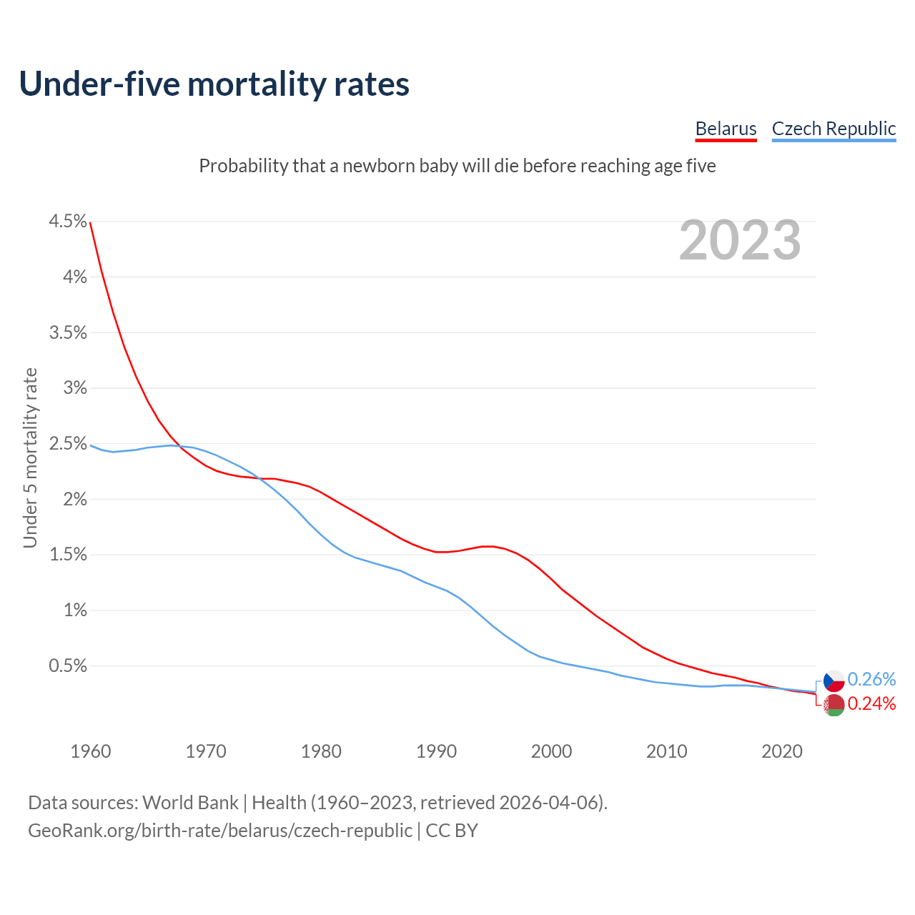The chance that a newborn baby will die before reaching age five is 0.24% in Belarus and 0.26% in the Czech Republic. Above is a chart with historical data on under-five mortality rates.