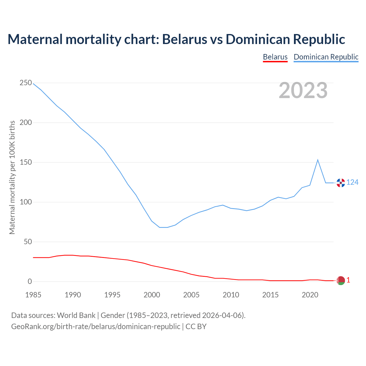 The maternal mortality rate, which is the probability of dying during childbirth or within 42 days of pregnancy termination, is 1 deaths per 100,000 live births in Belarus, compared to 124 deaths in the Dominican Republic.