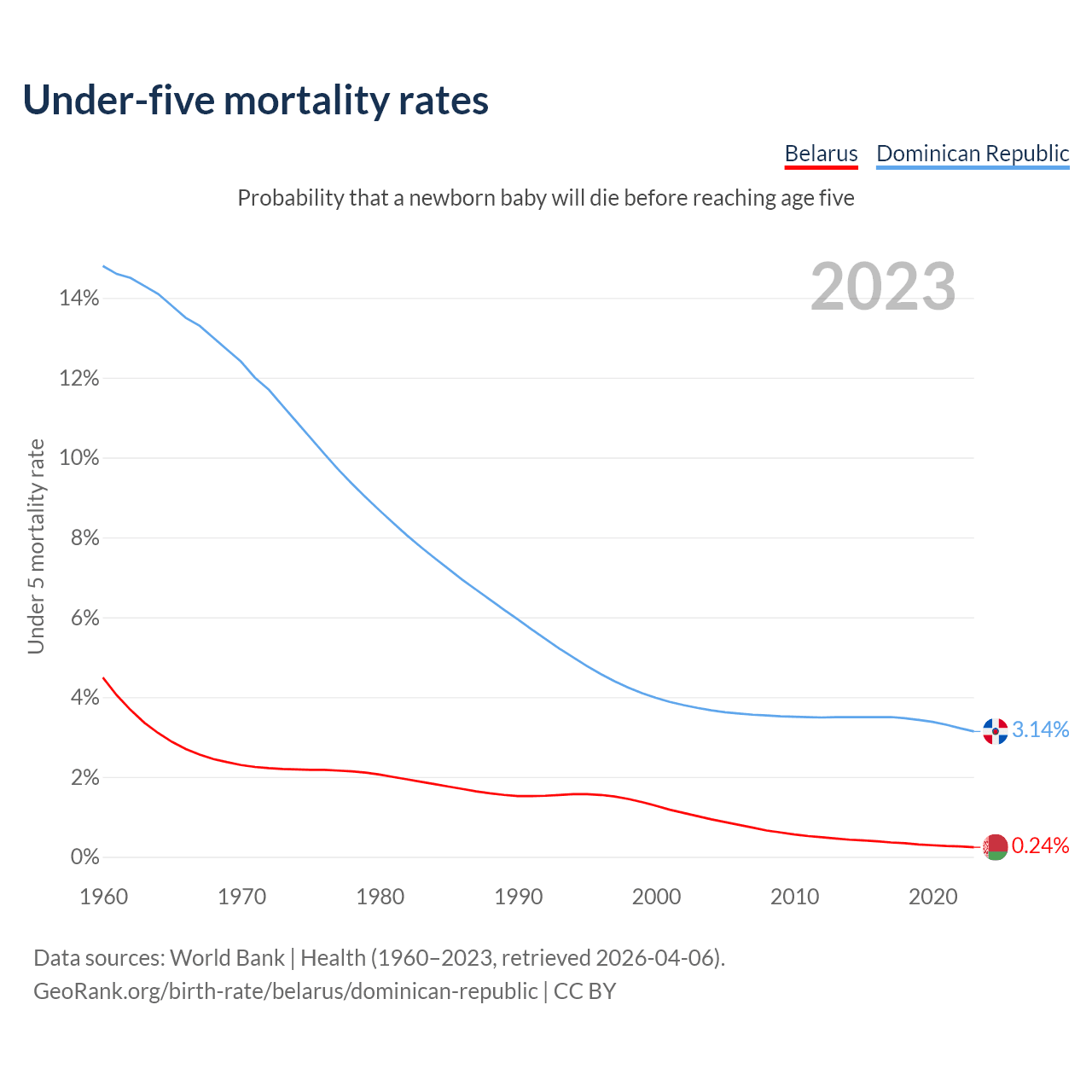 The chance that a newborn baby will die before reaching age five is 0.24% in Belarus and 3.14% in the Dominican Republic. Above is a chart with historical data on under-five mortality rates.