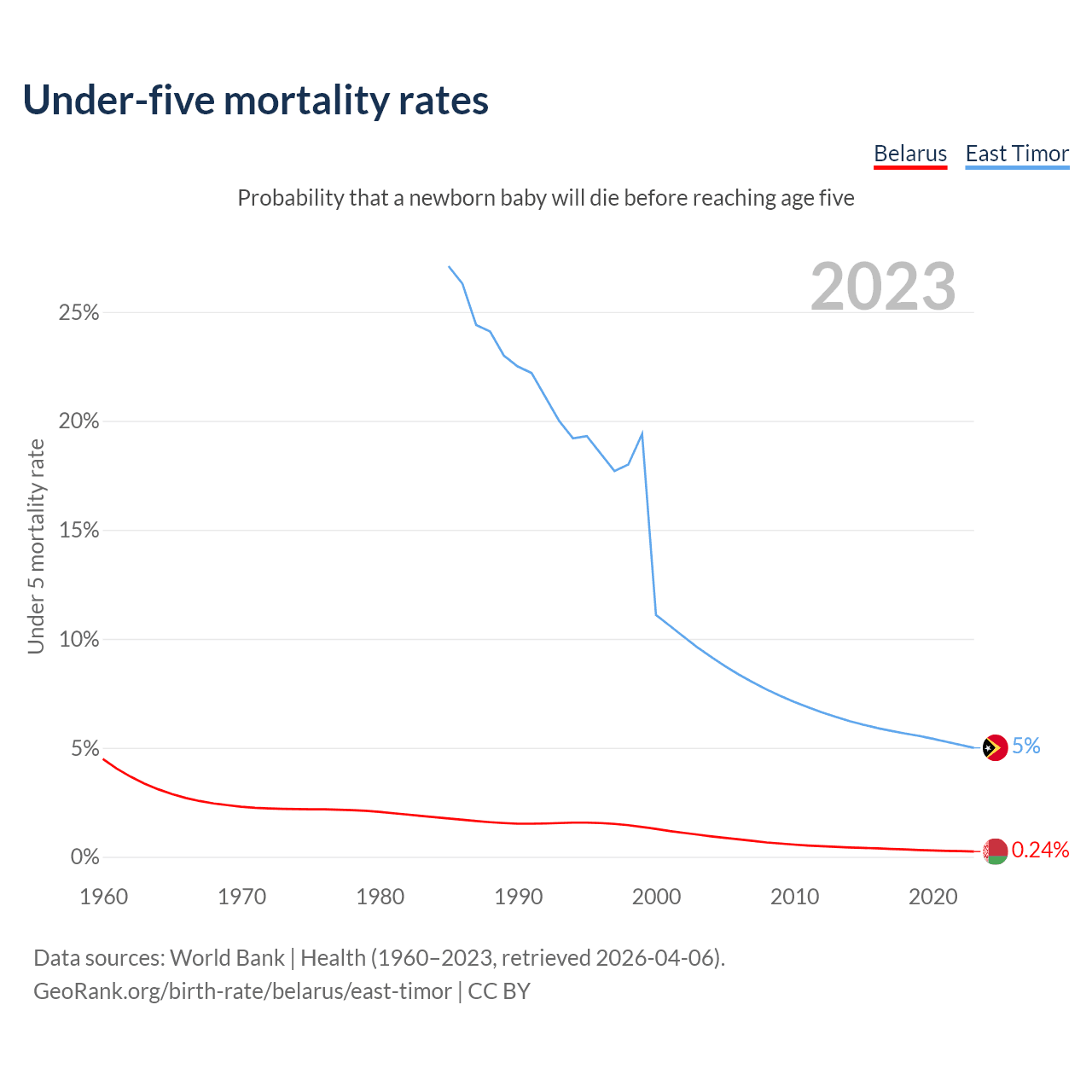 The chance that a newborn baby will die before reaching age five is 0.24% in Belarus and 5% in East Timor. Above is a chart with historical data on under-five mortality rates.