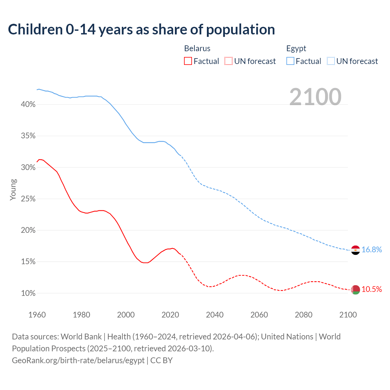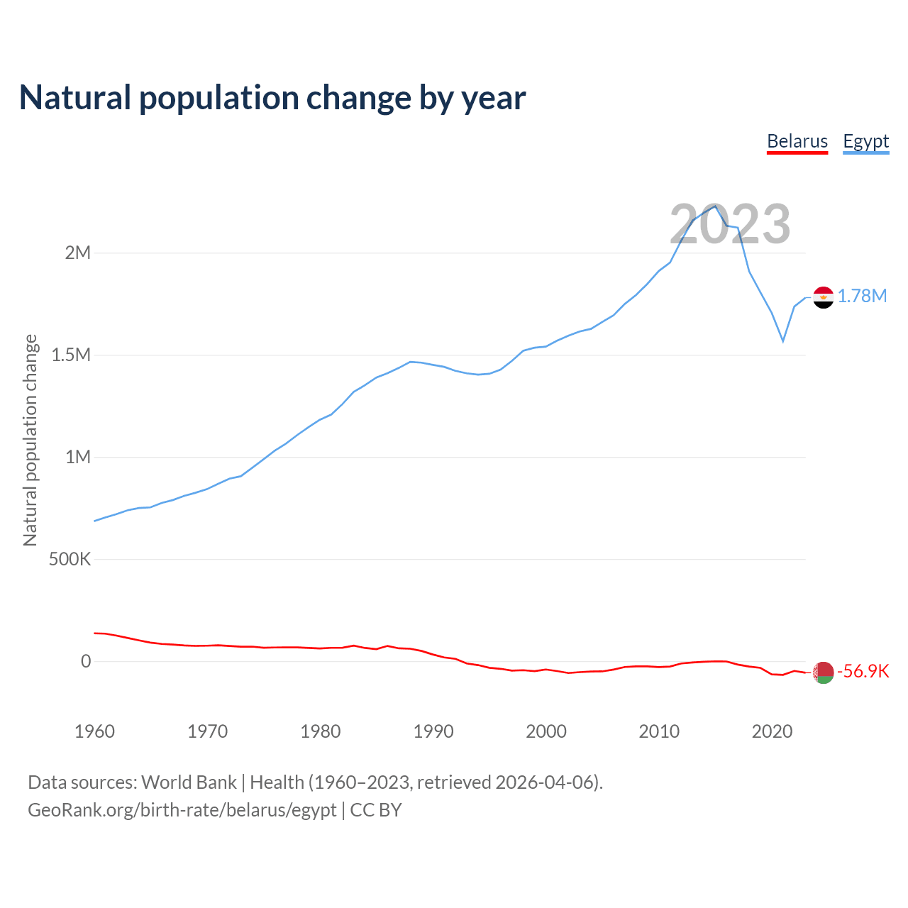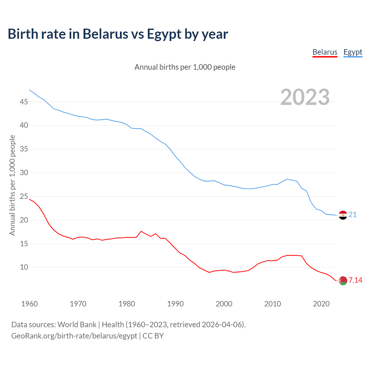 Belarus has an annual birth rate of 7.14 births per 1,000 people, compared to 21 for Egypt. The average number of children a woman is expected to have during her lifetime — the fertility rate, is 1.21 in Belarus and 2.75 in Egypt — 127.6% difference.
