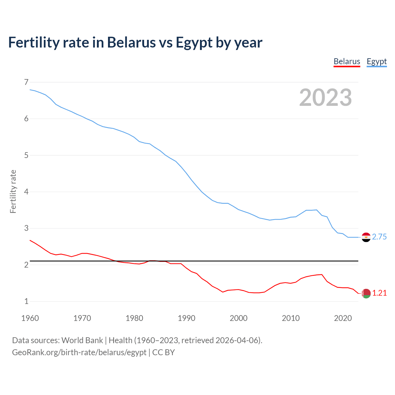 According to the latest available data on birth rates, the fertility rate in Belarus was 1.21 children per woman in 2023, compared to 2.75 in Egypt in 2023. The replacement level is considered to be 2.1 children per woman.