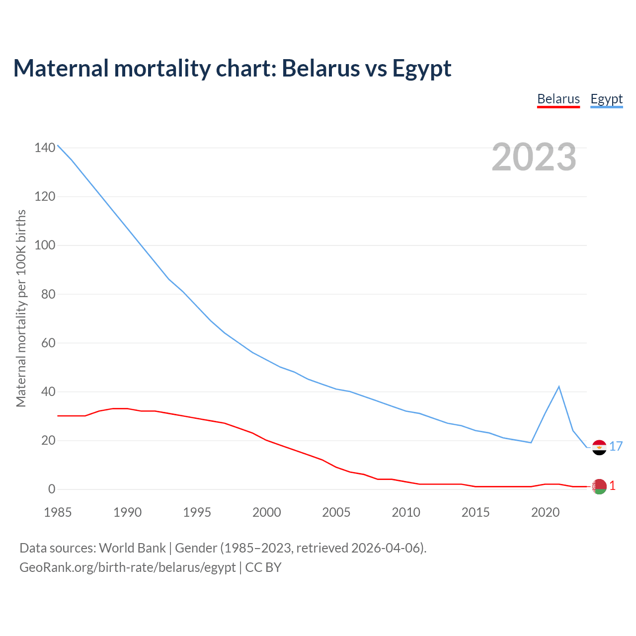 The maternal mortality rate, which is the probability of dying during childbirth or within 42 days of pregnancy termination, is 1 deaths per 100,000 live births in Belarus, compared to 17 deaths in Egypt.