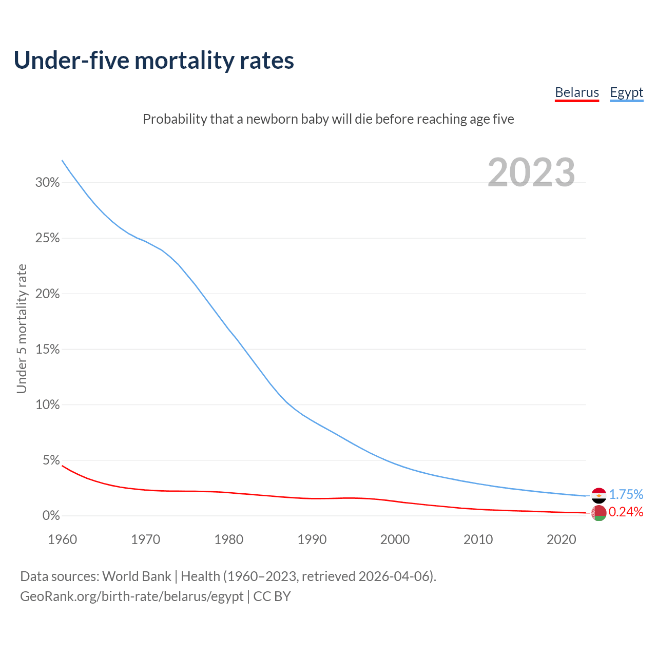 The chance that a newborn baby will die before reaching age five is 0.24% in Belarus and 1.75% in Egypt. Above is a chart with historical data on under-five mortality rates.