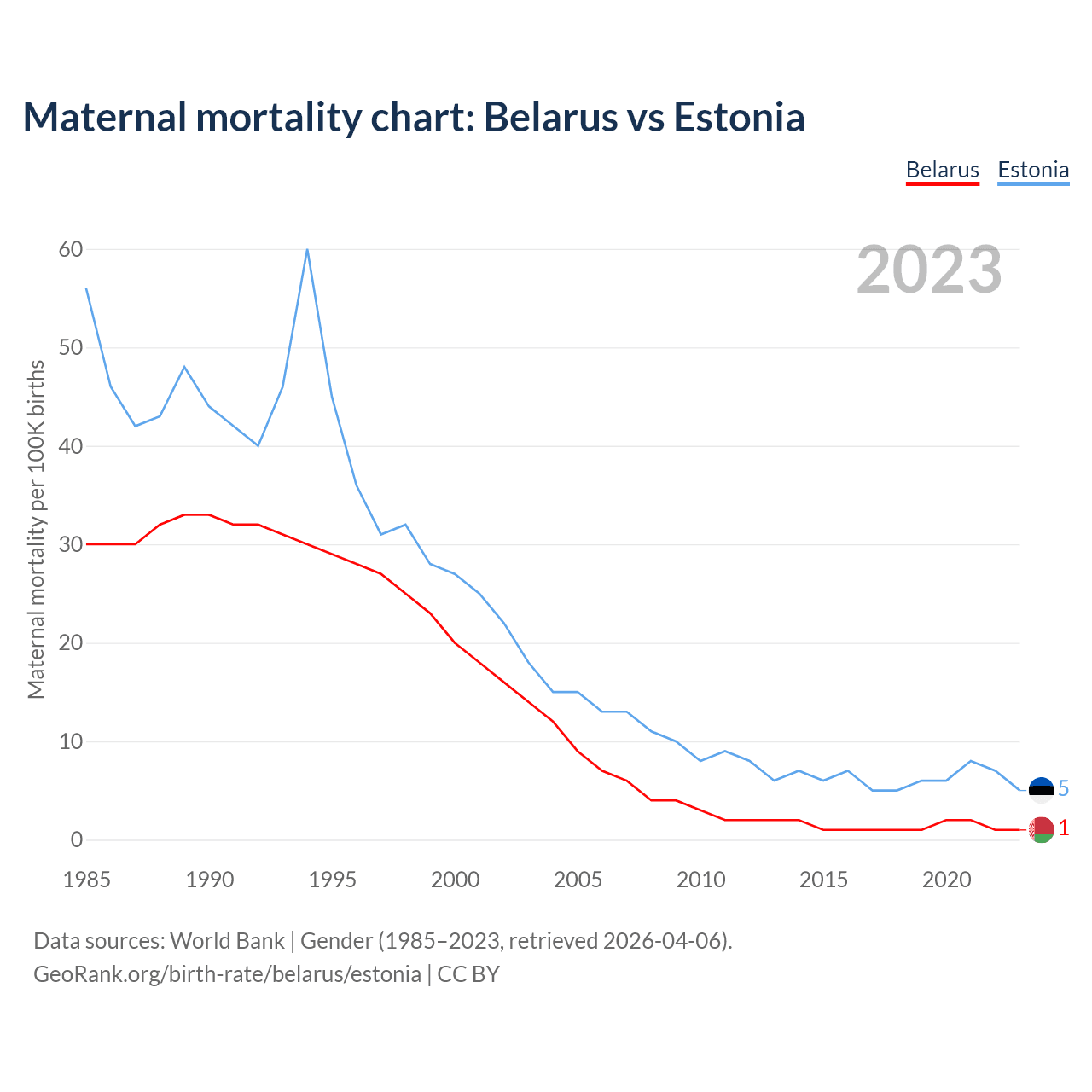 The maternal mortality rate, which is the probability of dying during childbirth or within 42 days of pregnancy termination, is 1 deaths per 100,000 live births in Belarus, compared to 5 deaths in Estonia.