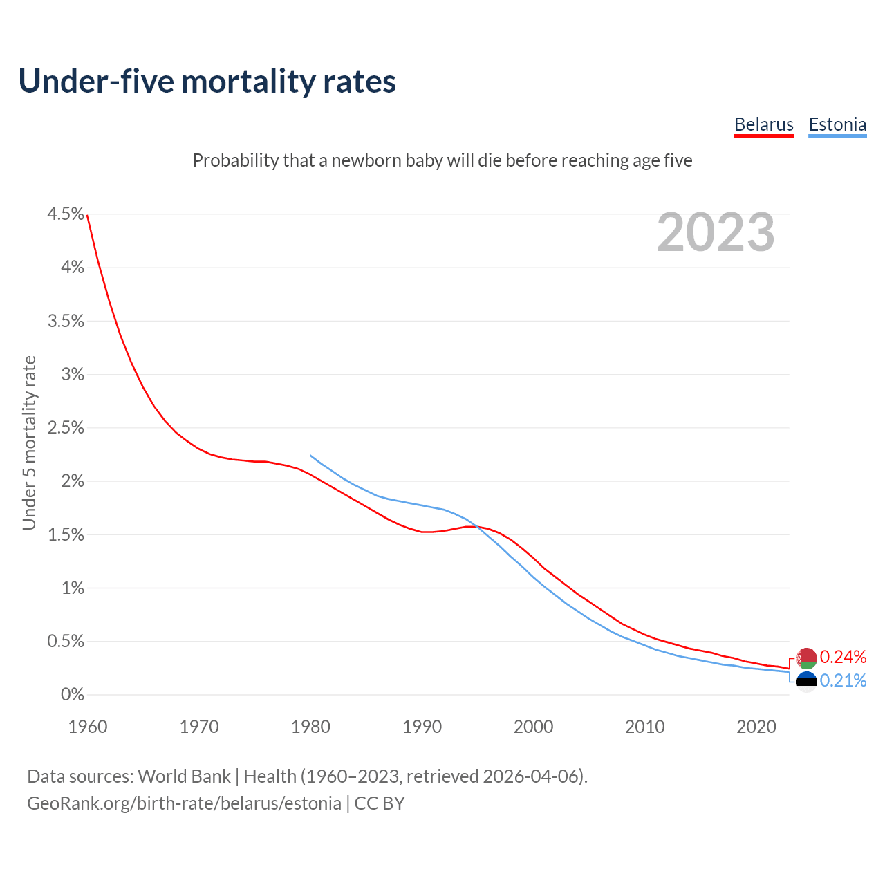 The chance that a newborn baby will die before reaching age five is 0.24% in Belarus and 0.21% in Estonia. Above is a chart with historical data on under-five mortality rates.