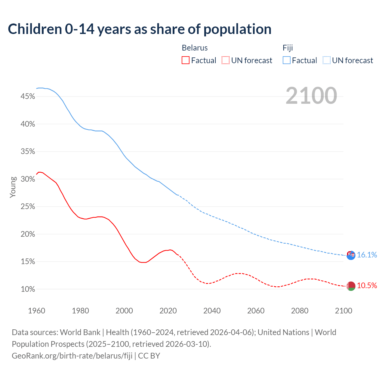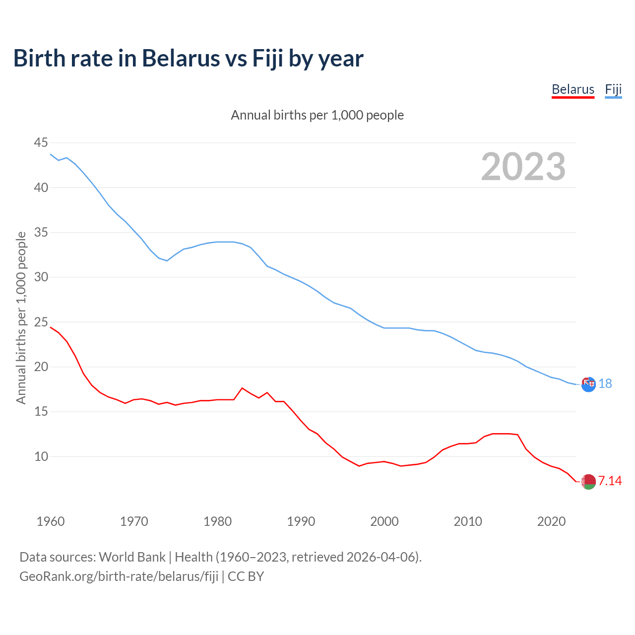 Belarus has an annual birth rate of 7.14 births per 1,000 people, compared to 18 for Fiji. The average number of children a woman is expected to have during her lifetime — the fertility rate, is 1.21 in Belarus and 2.28 in Fiji — 88.8% difference.