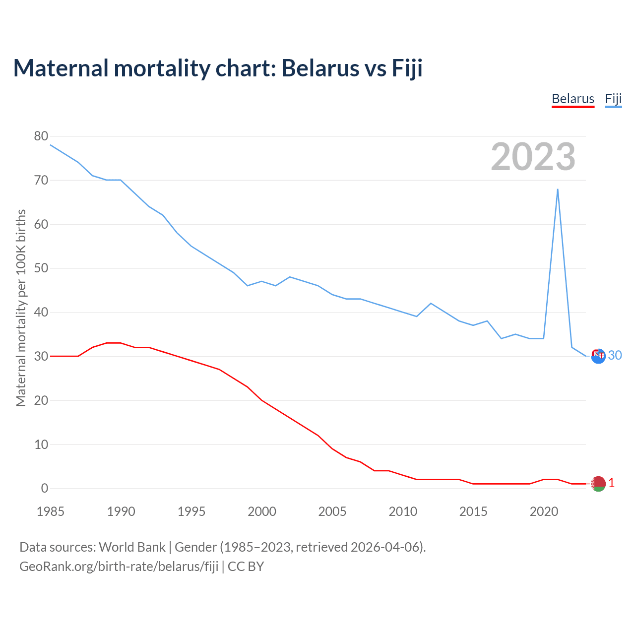 The maternal mortality rate, which is the probability of dying during childbirth or within 42 days of pregnancy termination, is 1 deaths per 100,000 live births in Belarus, compared to 30 deaths in Fiji.