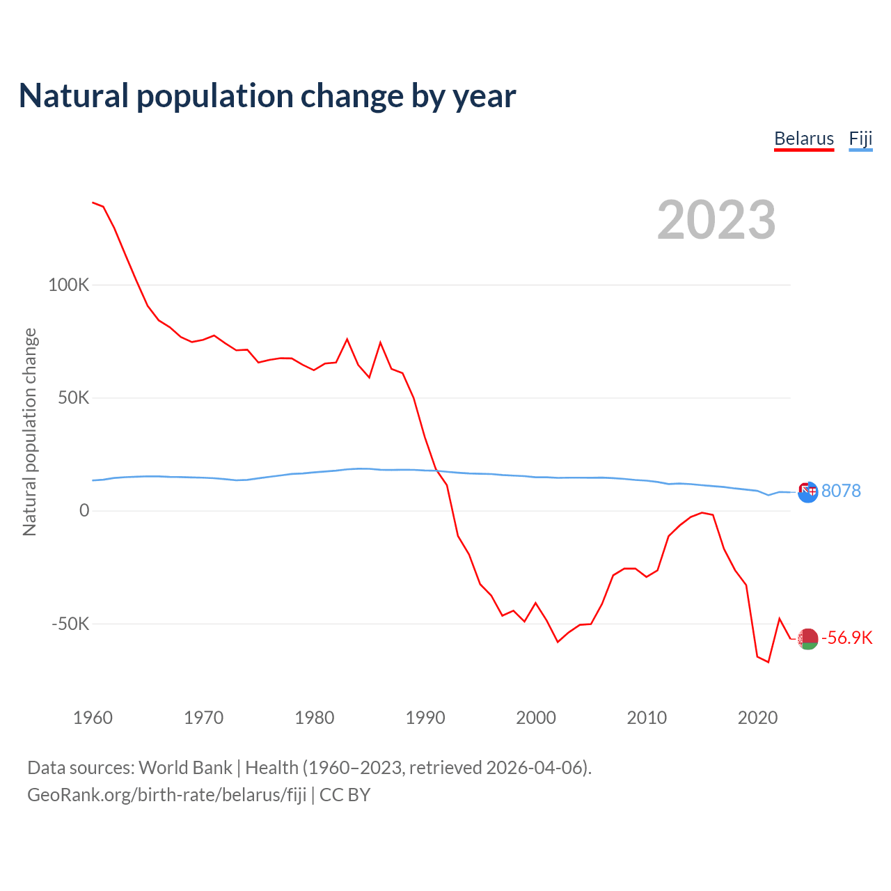 According to the latest available data on birth rates, the fertility rate in Belarus was 1.21 children per woman in 2023, compared to 2.28 in Fiji in 2023. The replacement level is considered to be 2.1 children per woman.