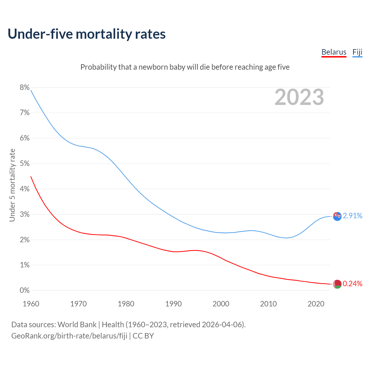 The chance that a newborn baby will die before reaching age five is 0.24% in Belarus and 2.91% in Fiji. Above is a chart with historical data on under-five mortality rates.
