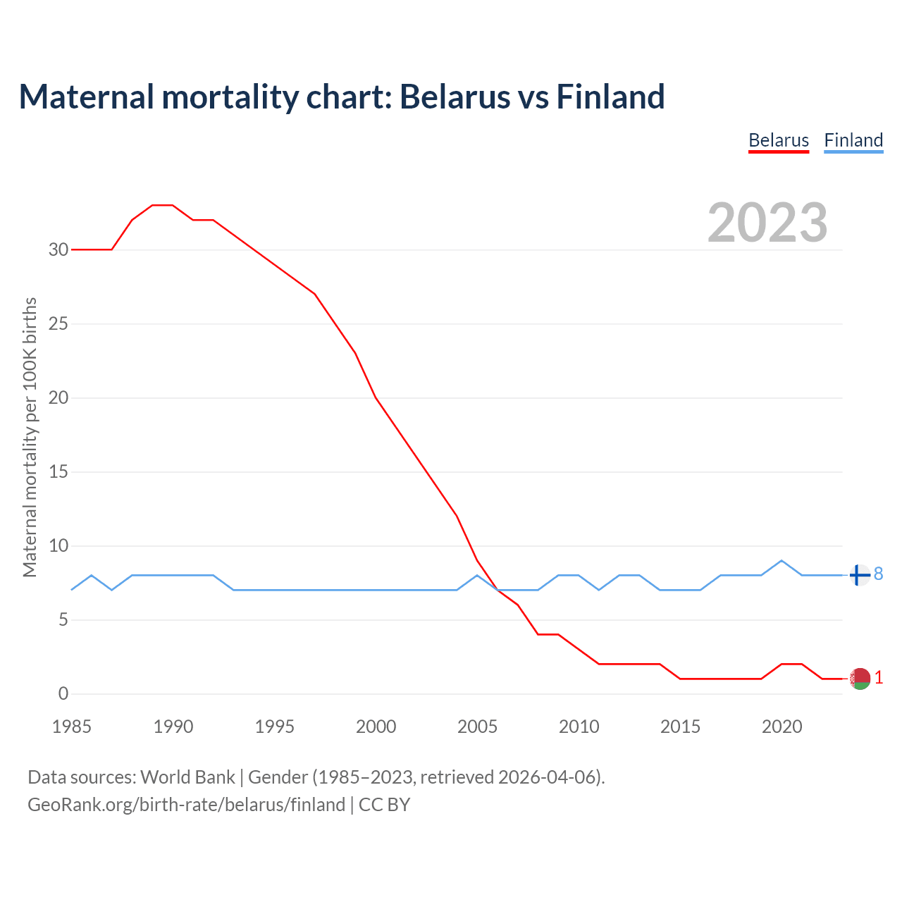 The maternal mortality rate, which is the probability of dying during childbirth or within 42 days of pregnancy termination, is 1 deaths per 100,000 live births in Belarus, compared to 8 deaths in Finland.
