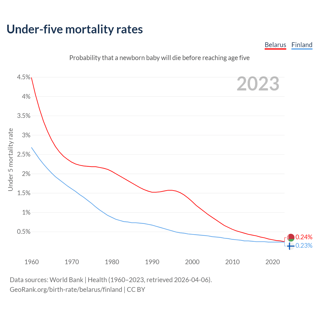 The chance that a newborn baby will die before reaching age five is 0.24% in Belarus and 0.23% in Finland. Above is a chart with historical data on under-five mortality rates.