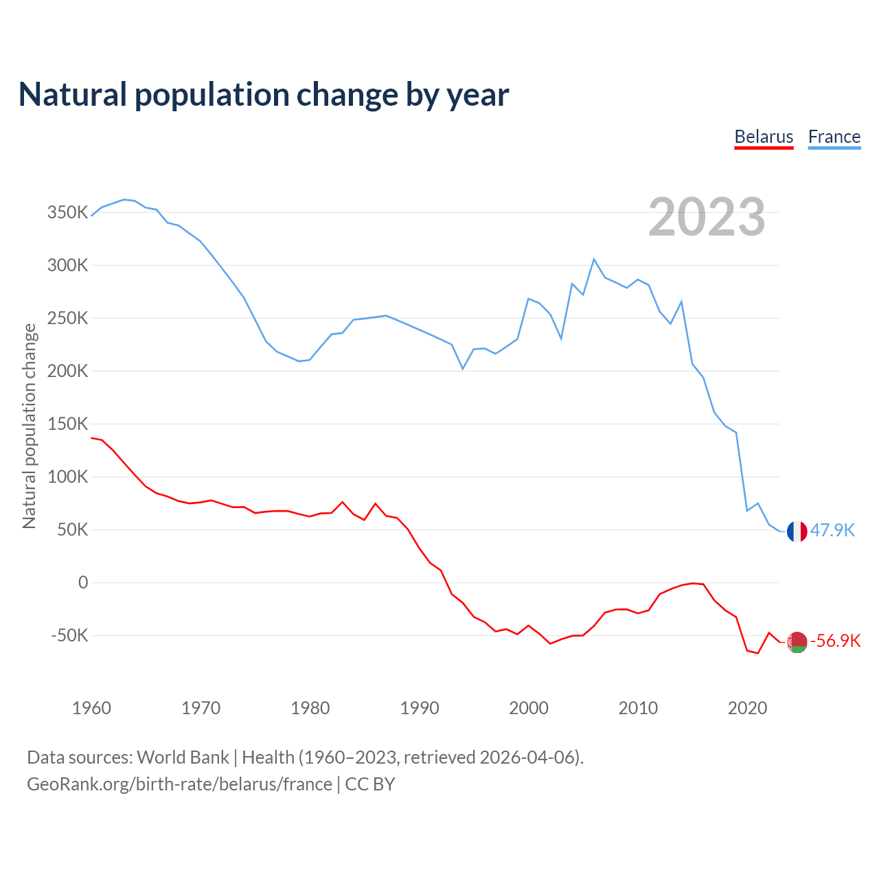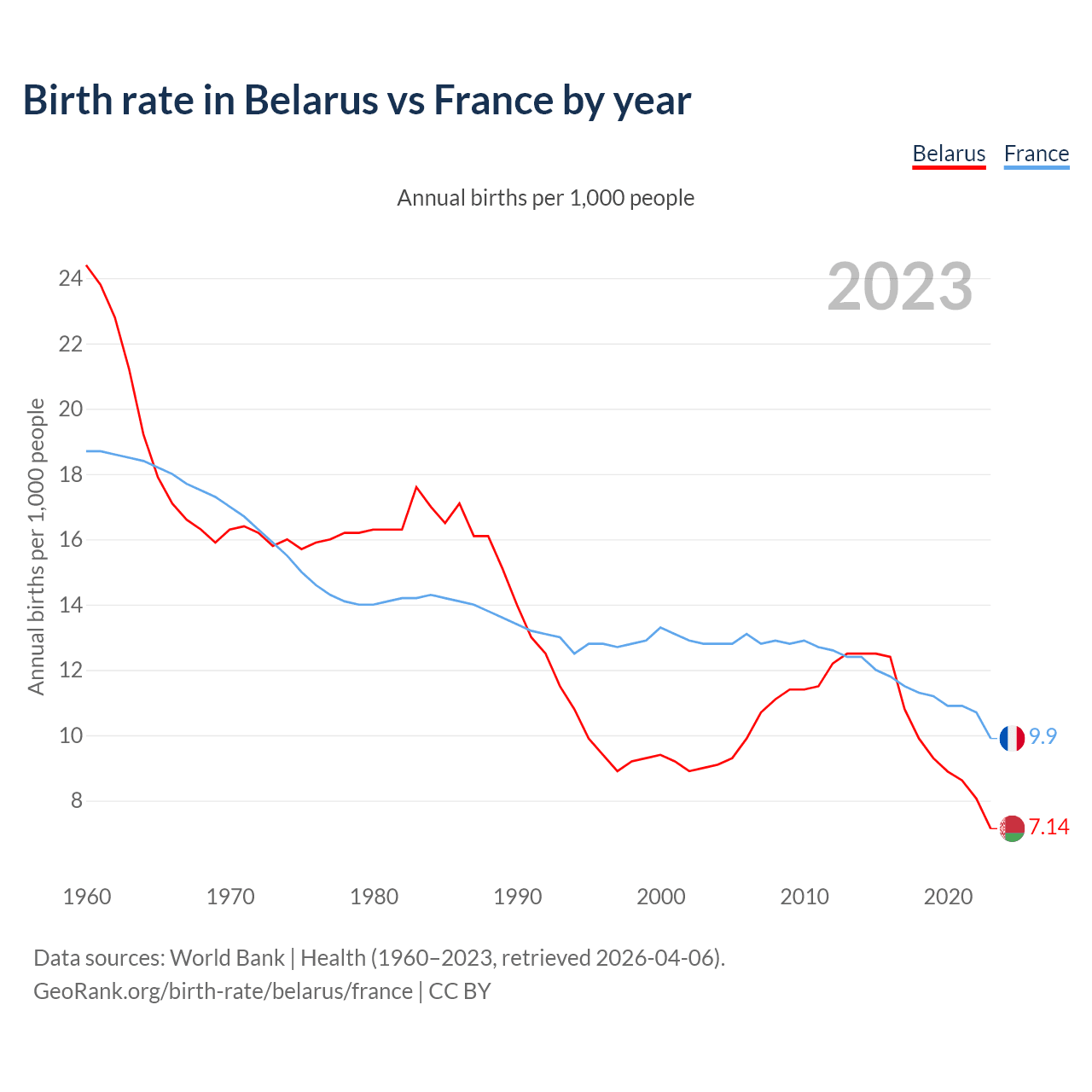 Belarus has an annual birth rate of 7.14 births per 1,000 people, compared to 9.9 for France. The average number of children a woman is expected to have during her lifetime — the fertility rate, is 1.21 in Belarus and 1.66 in France — 37.4% difference.