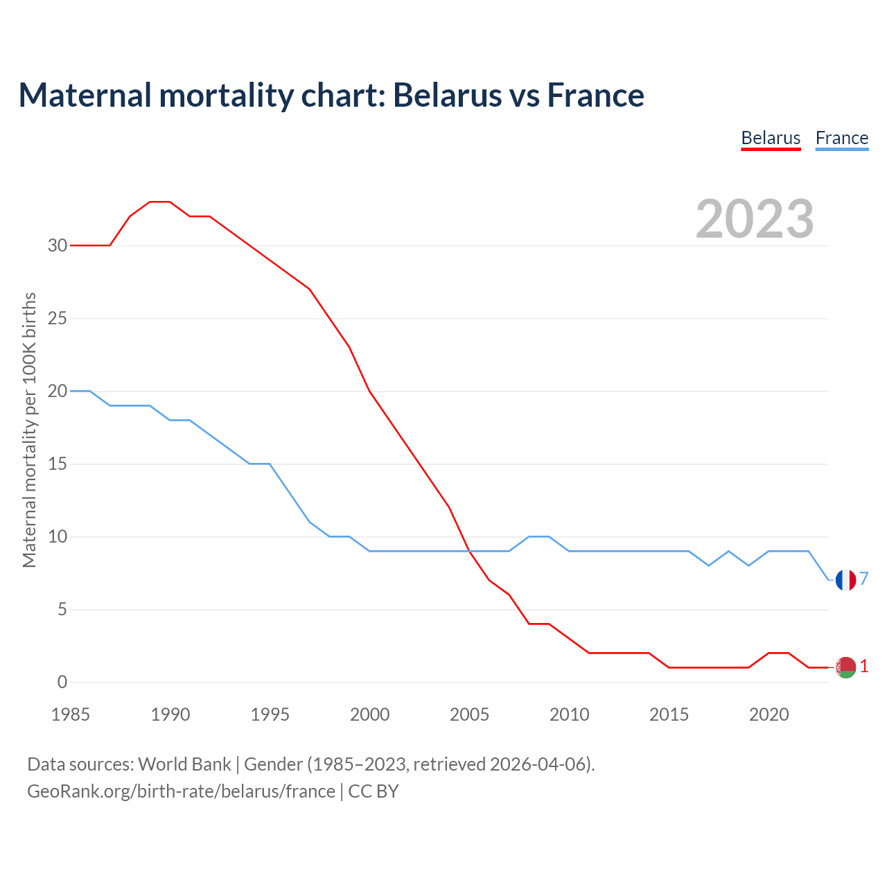 The maternal mortality rate, which is the probability of dying during childbirth or within 42 days of pregnancy termination, is 1 deaths per 100,000 live births in Belarus, compared to 7 deaths in France.
