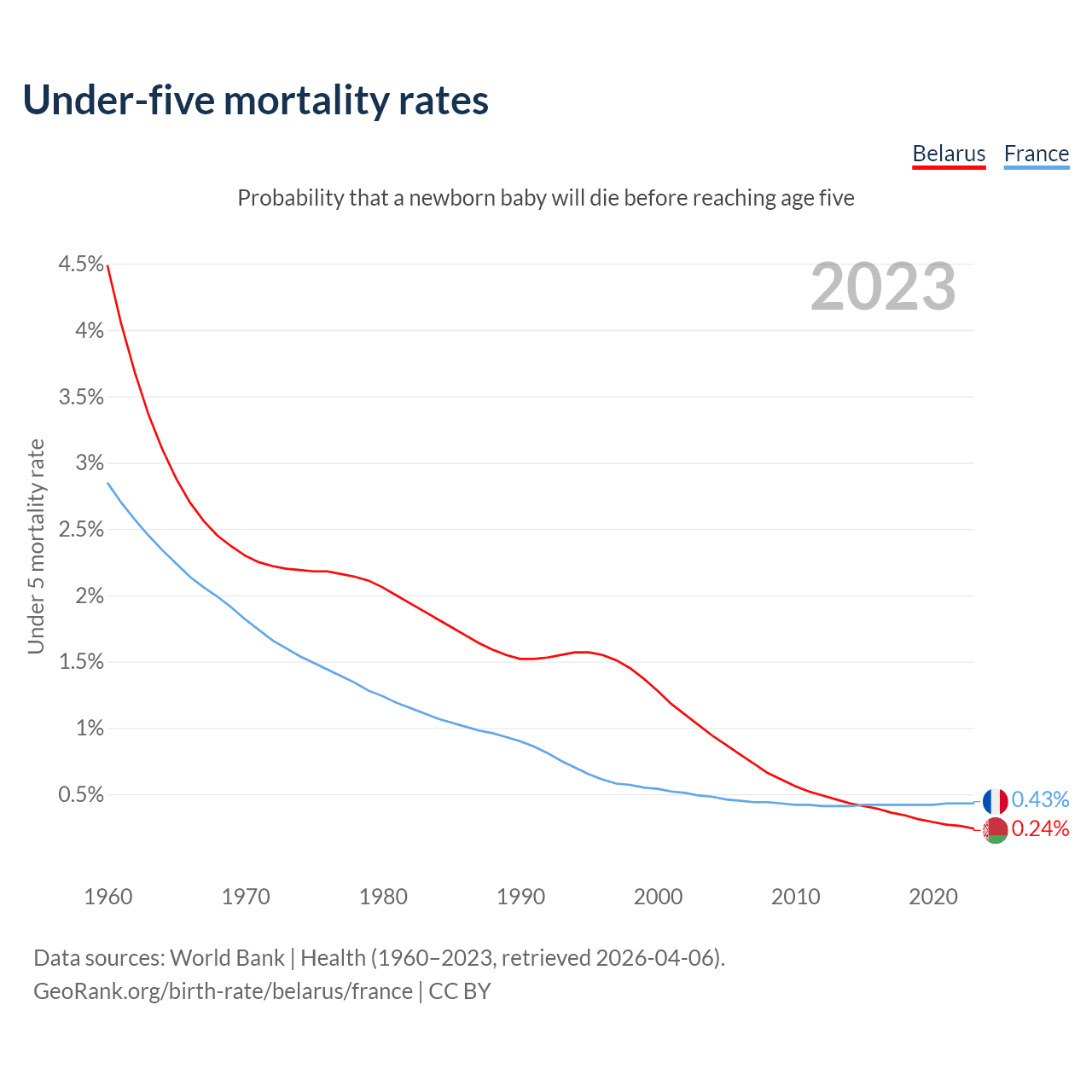 The chance that a newborn baby will die before reaching age five is 0.24% in Belarus and 0.43% in France. Above is a chart with historical data on under-five mortality rates.