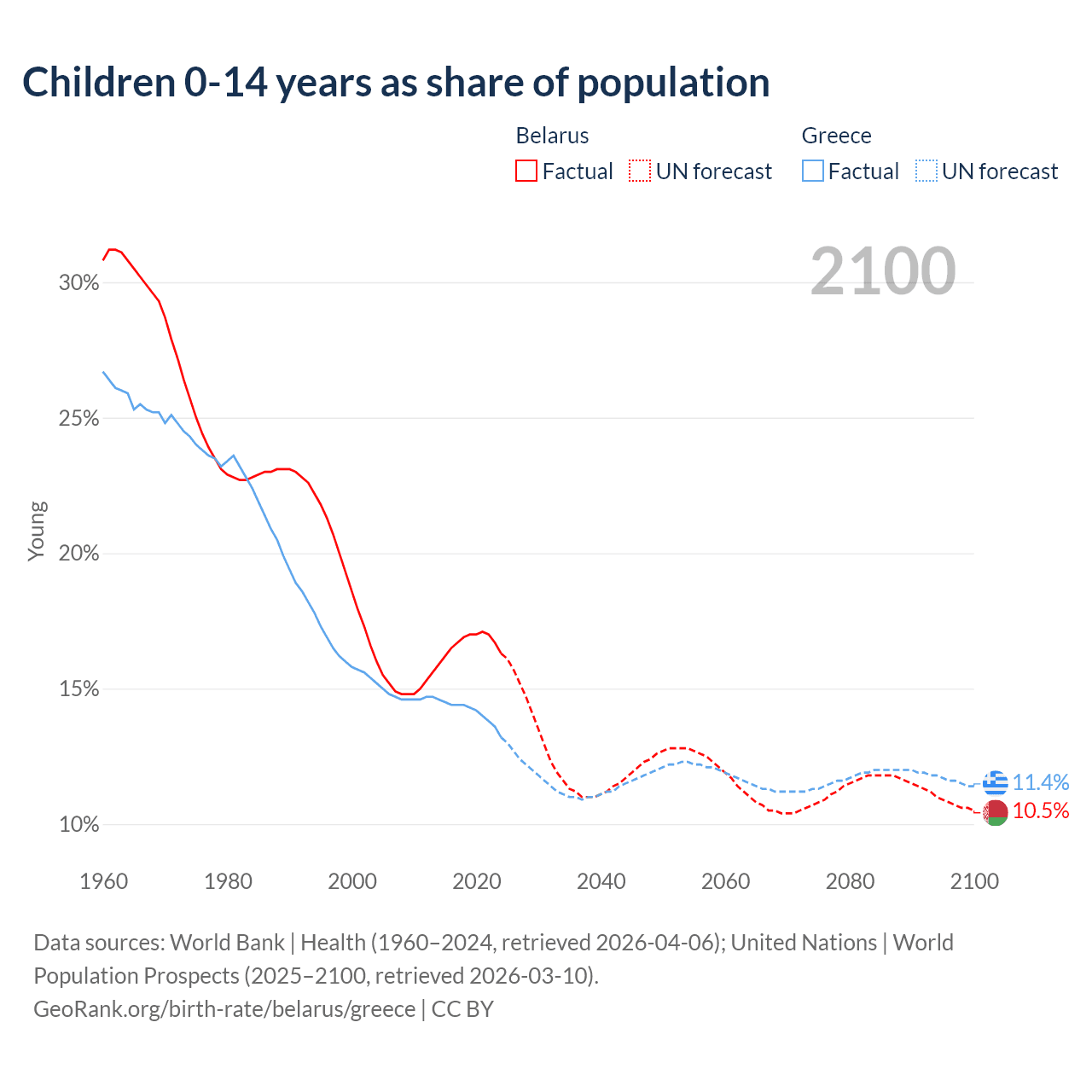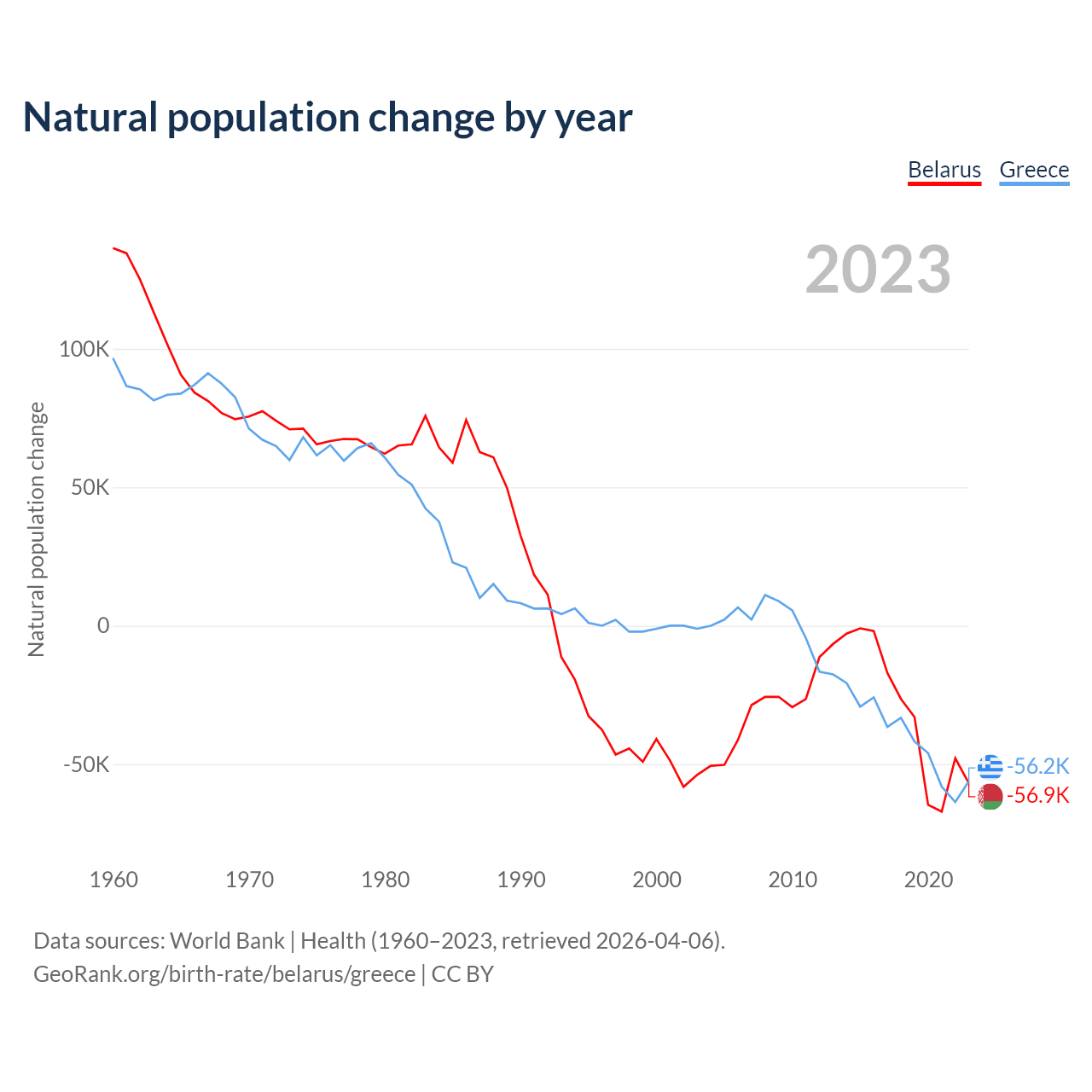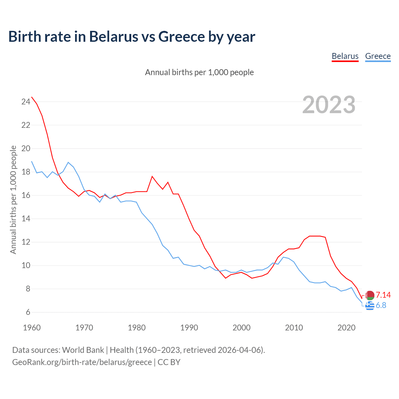 Belarus has an annual birth rate of 7.14 births per 1,000 people, compared to 6.8 for Greece. The average number of children a woman is expected to have during her lifetime — the fertility rate, is 1.21 in Belarus and 1.32 in Greece — 9.27% difference.