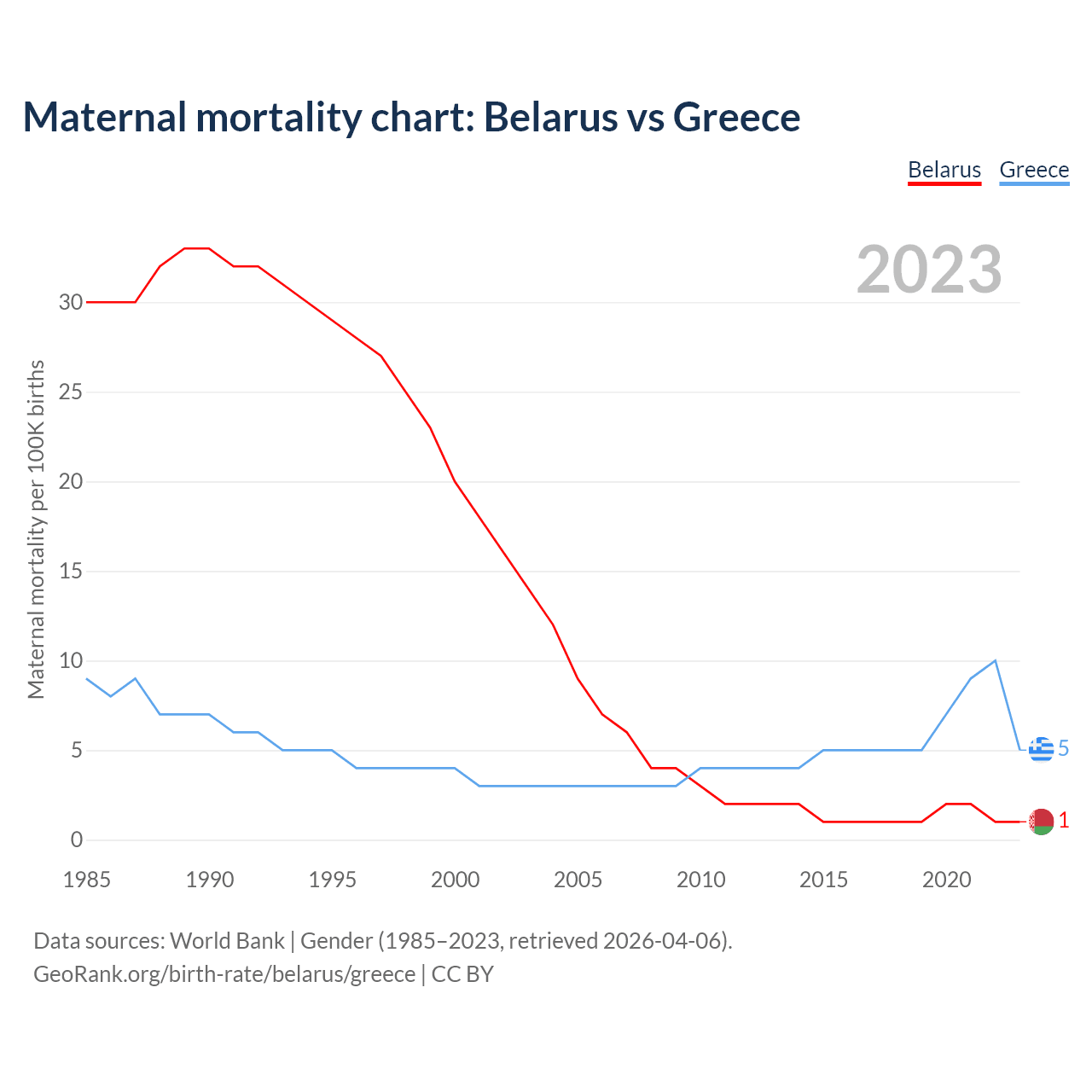 The maternal mortality rate, which is the probability of dying during childbirth or within 42 days of pregnancy termination, is 1 deaths per 100,000 live births in Belarus, compared to 5 deaths in Greece.
