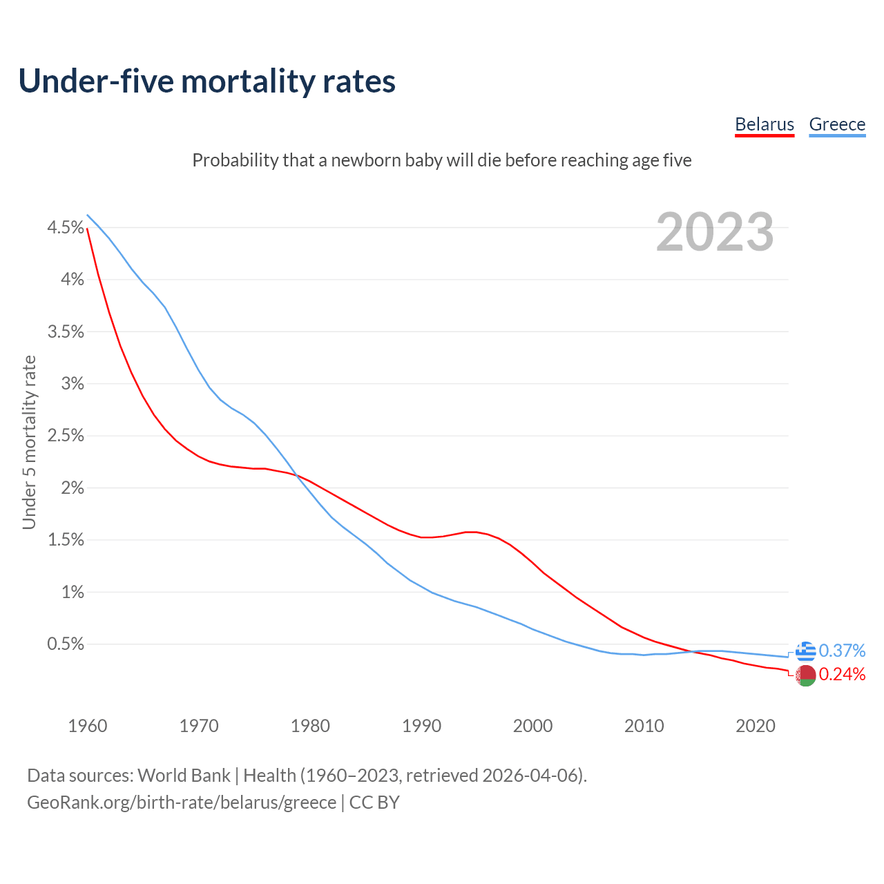 The chance that a newborn baby will die before reaching age five is 0.24% in Belarus and 0.37% in Greece. Above is a chart with historical data on under-five mortality rates.