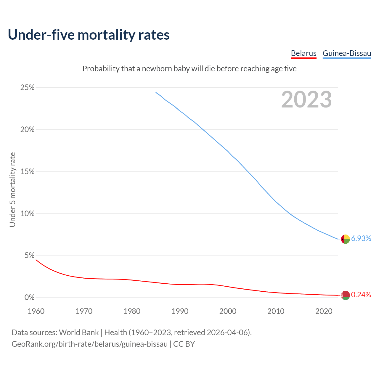 The chance that a newborn baby will die before reaching age five is 0.24% in Belarus and 6.93% in Guinea-Bissau. Above is a chart with historical data on under-five mortality rates.