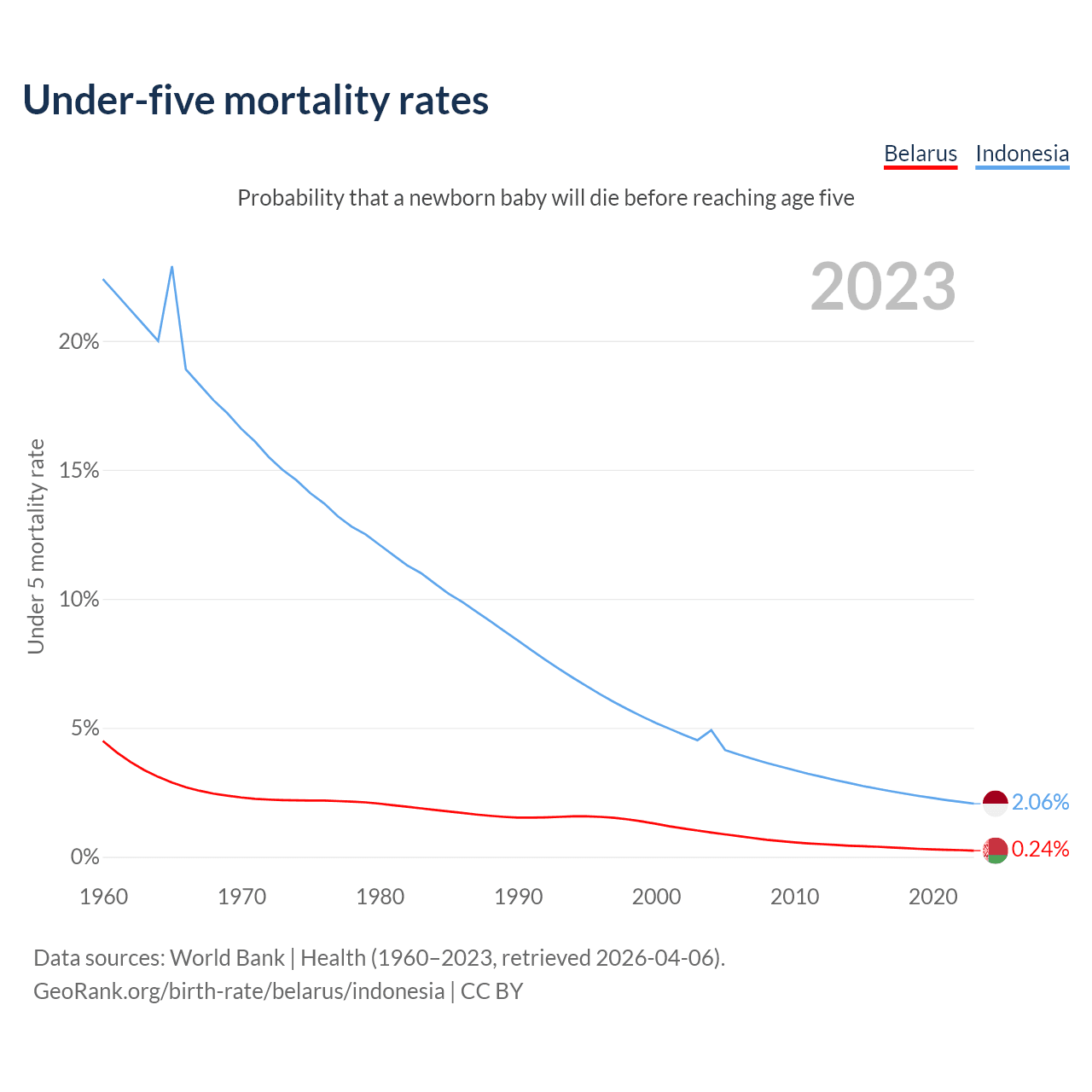 The chance that a newborn baby will die before reaching age five is 0.24% in Belarus and 2.06% in Indonesia. Above is a chart with historical data on under-five mortality rates.