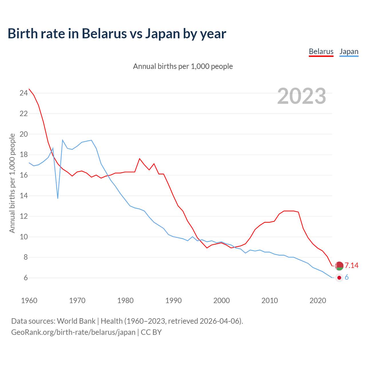 Belarus has an annual birth rate of 7.14 births per 1,000 people, compared to 6 for Japan. The average number of children a woman is expected to have during her lifetime — the fertility rate, is 1.21 in Belarus and 1.2 in Japan — 0.66% difference.
