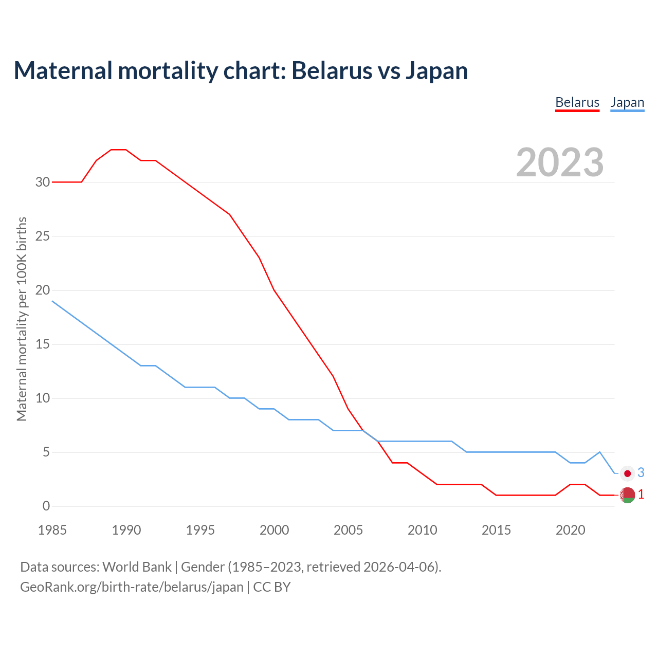 The maternal mortality rate, which is the probability of dying during childbirth or within 42 days of pregnancy termination, is 1 deaths per 100,000 live births in Belarus, compared to 3 deaths in Japan.