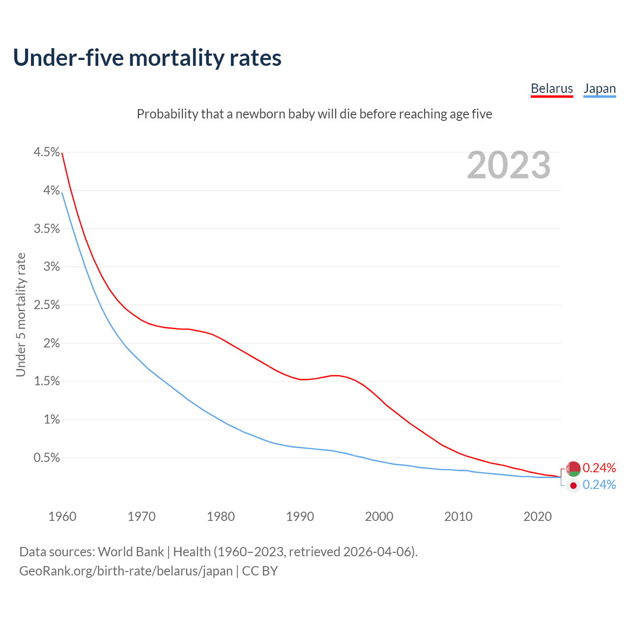 The chance that a newborn baby will die before reaching age five is 0.24% in Belarus and 0.24% in Japan. Above is a chart with historical data on under-five mortality rates.