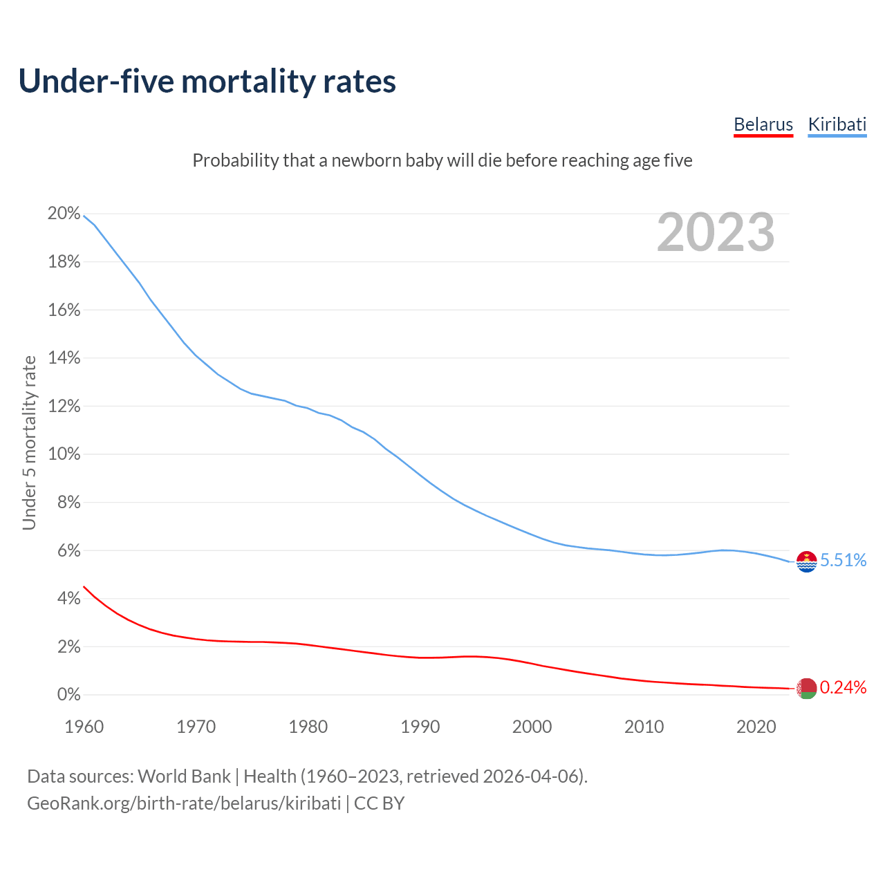 The chance that a newborn baby will die before reaching age five is 0.24% in Belarus and 5.51% in Kiribati. Above is a chart with historical data on under-five mortality rates.