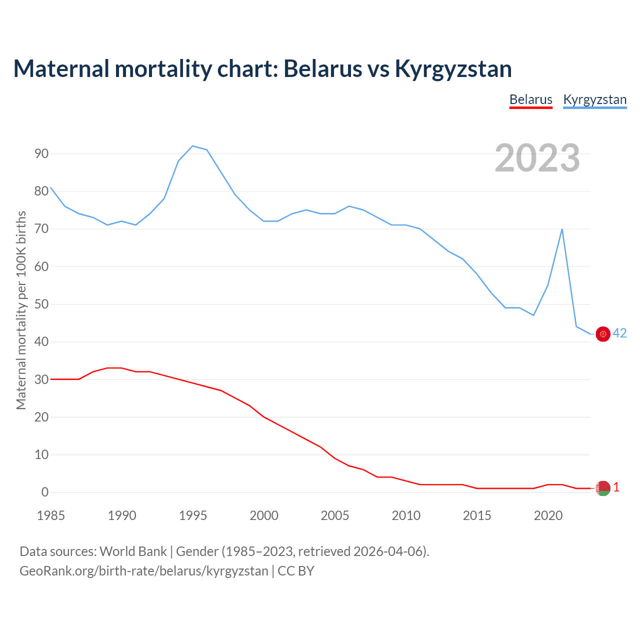 The maternal mortality rate, which is the probability of dying during childbirth or within 42 days of pregnancy termination, is 1 deaths per 100,000 live births in Belarus, compared to 42 deaths in Kyrgyzstan.