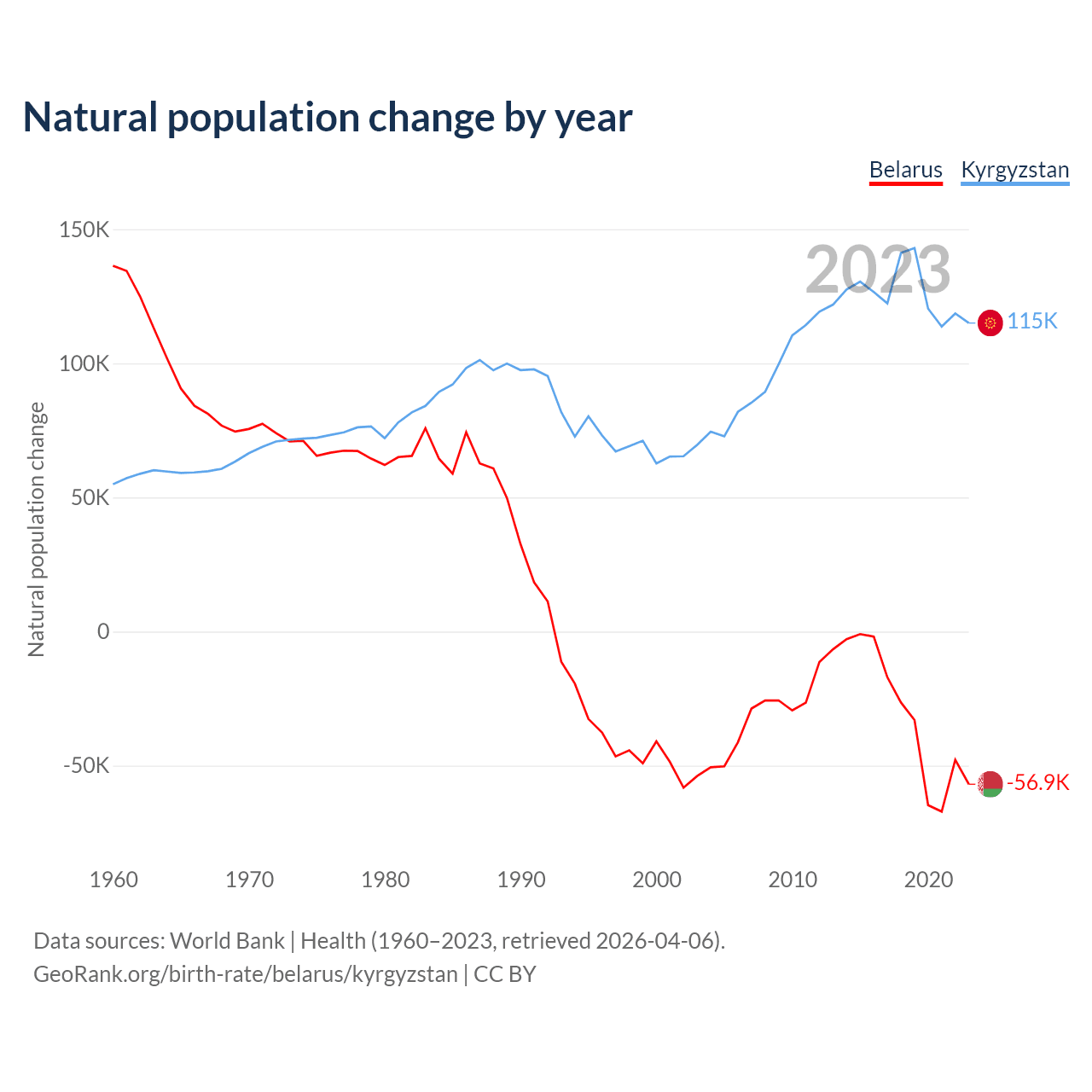 According to the latest available data on birth rates, the fertility rate in Belarus was 1.21 children per woman in 2023, compared to 2.7 in Kyrgyzstan in 2023. The replacement level is considered to be 2.1 children per woman.