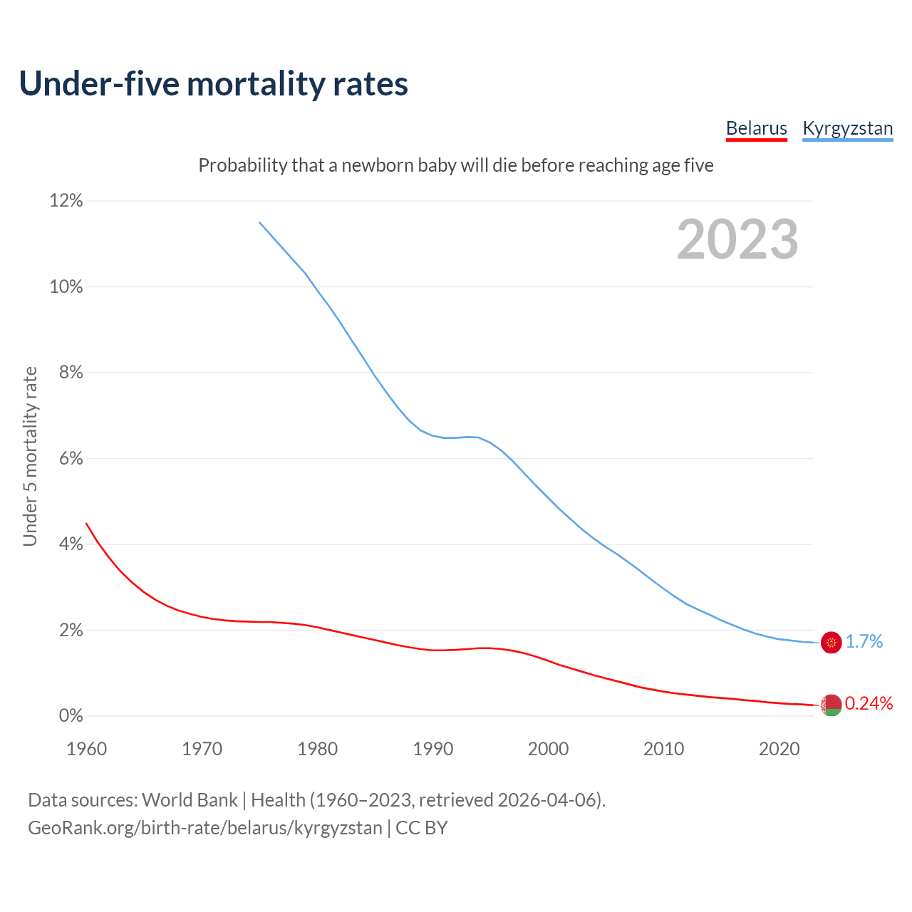 The chance that a newborn baby will die before reaching age five is 0.24% in Belarus and 1.7% in Kyrgyzstan. Above is a chart with historical data on under-five mortality rates.