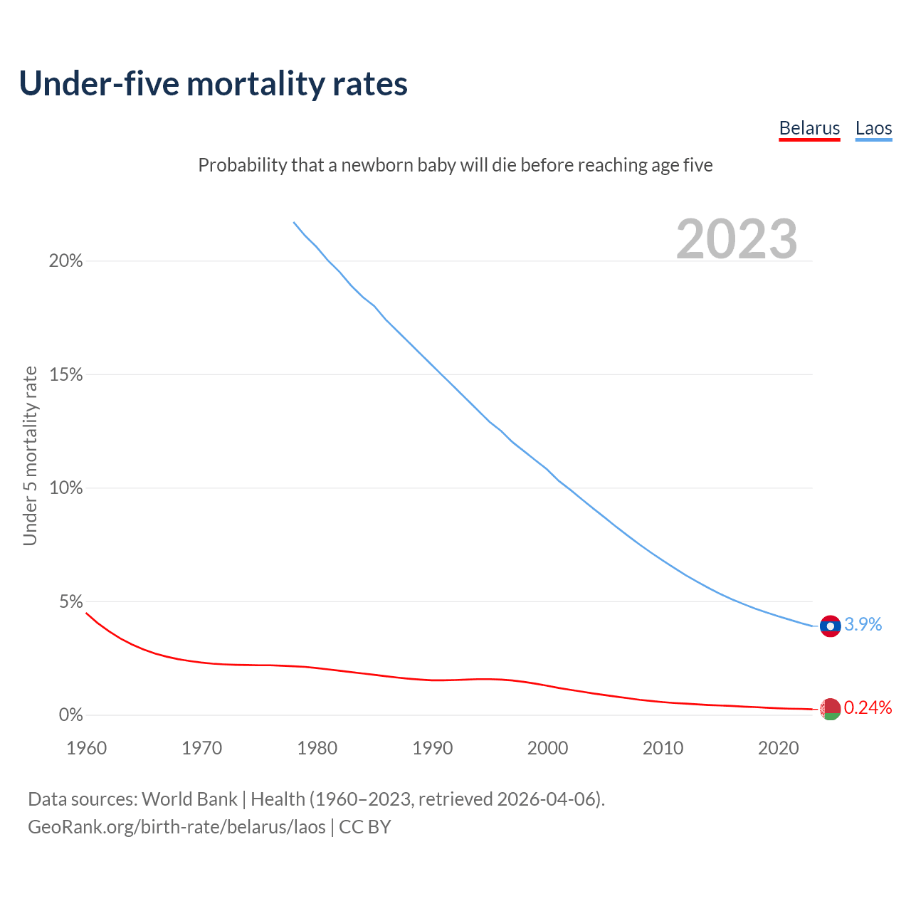 The chance that a newborn baby will die before reaching age five is 0.24% in Belarus and 3.9% in Laos. Above is a chart with historical data on under-five mortality rates.