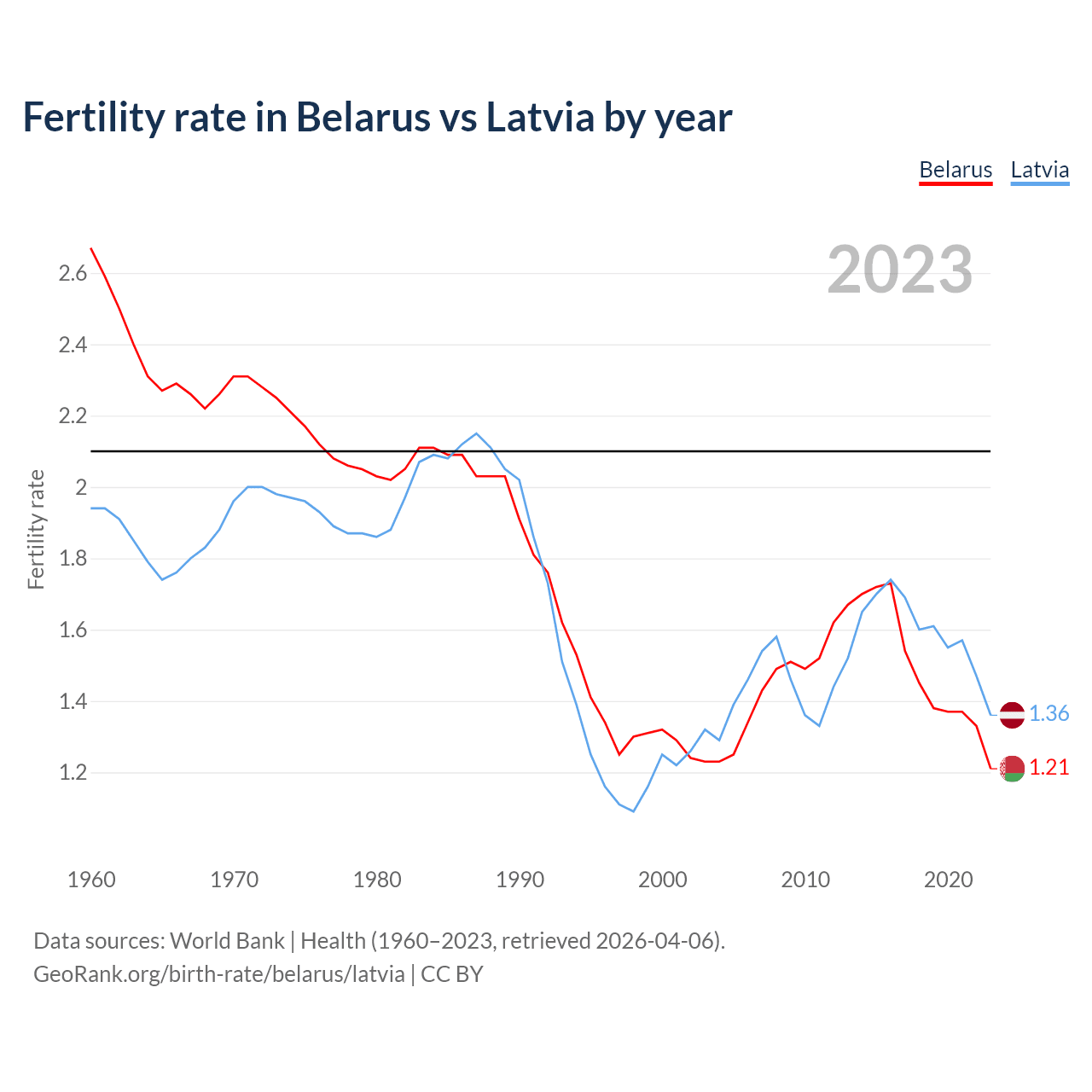According to the latest available data on birth rates, the fertility rate in Belarus was 1.21 children per woman in 2023, compared to 1.36 in Latvia in 2023. The replacement level is considered to be 2.1 children per woman.