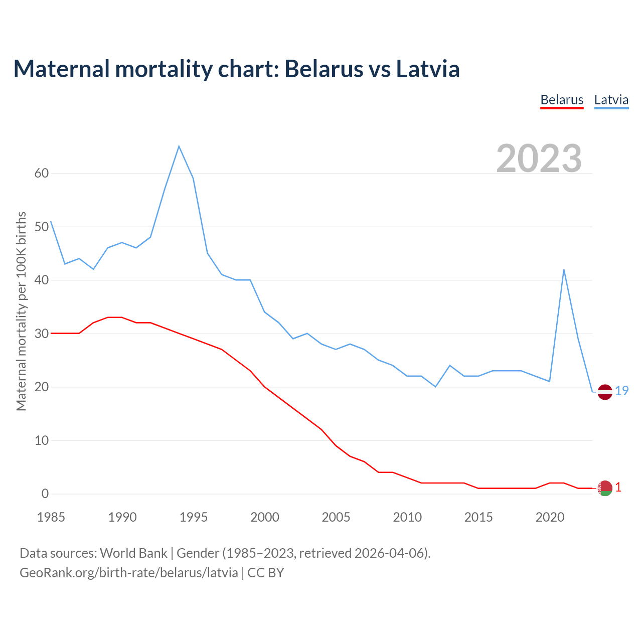 The maternal mortality rate, which is the probability of dying during childbirth or within 42 days of pregnancy termination, is 1 deaths per 100,000 live births in Belarus, compared to 19 deaths in Latvia.