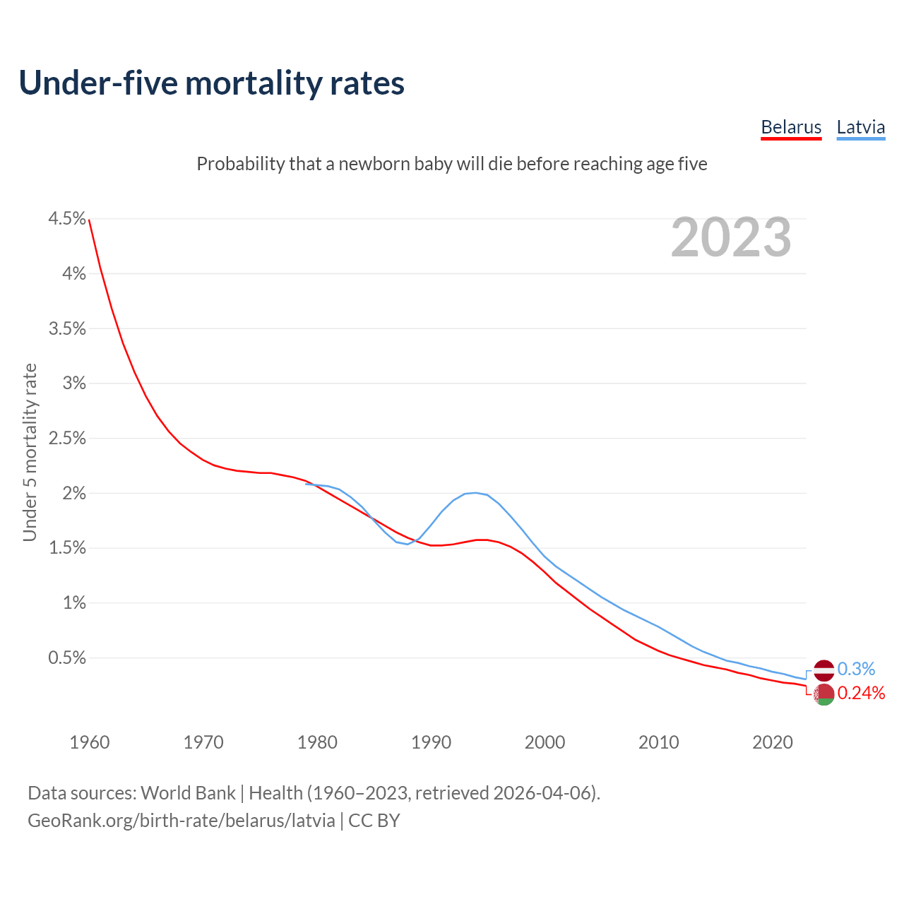 The chance that a newborn baby will die before reaching age five is 0.24% in Belarus and 0.3% in Latvia. Above is a chart with historical data on under-five mortality rates.
