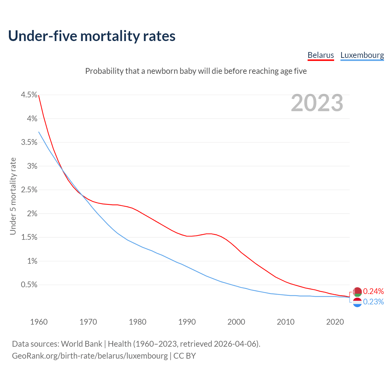 The chance that a newborn baby will die before reaching age five is 0.24% in Belarus and 0.23% in Luxembourg. Above is a chart with historical data on under-five mortality rates.