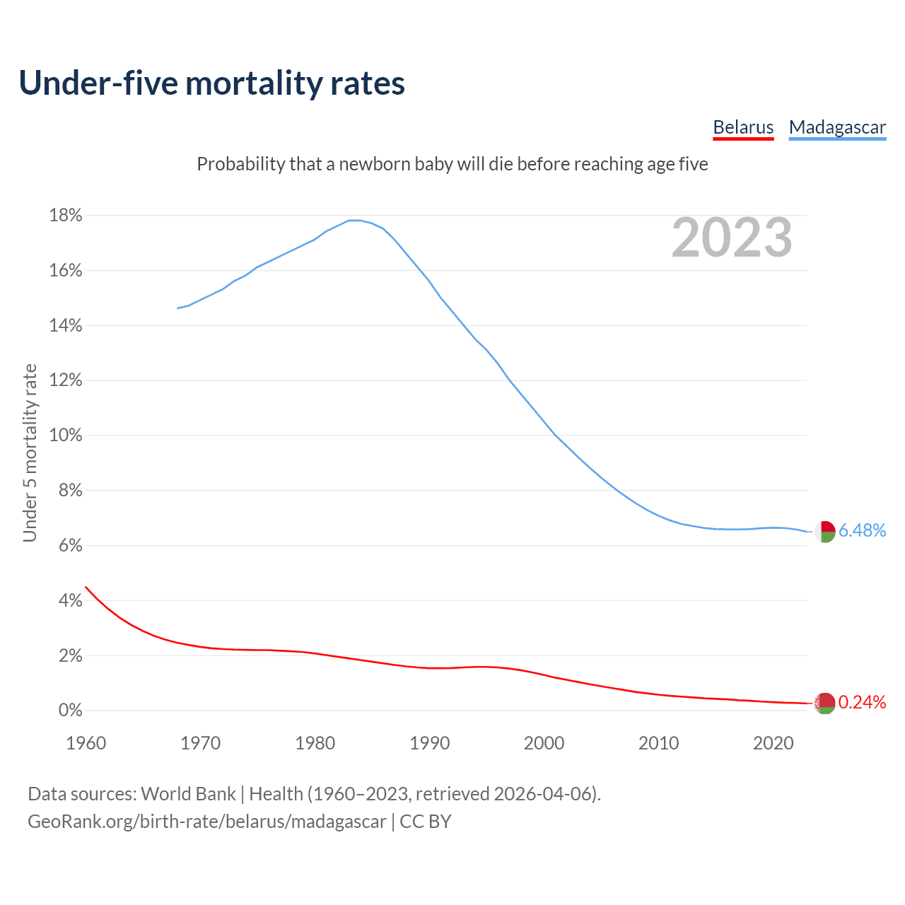 The chance that a newborn baby will die before reaching age five is 0.24% in Belarus and 6.48% in Madagascar. Above is a chart with historical data on under-five mortality rates.