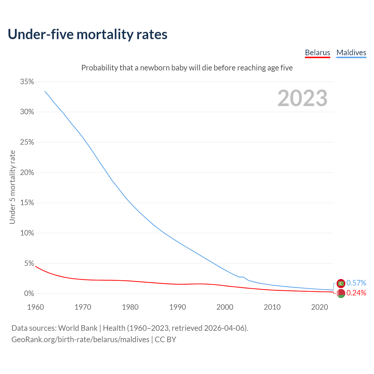 The chance that a newborn baby will die before reaching age five is 0.24% in Belarus and 0.57% in Maldives. Above is a chart with historical data on under-five mortality rates.