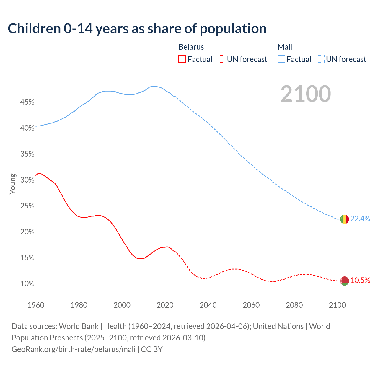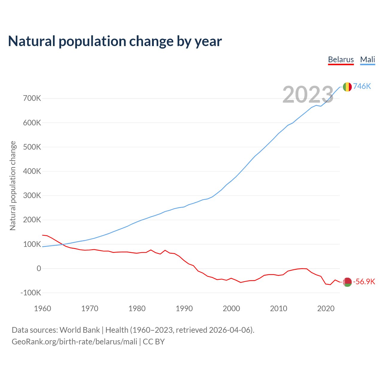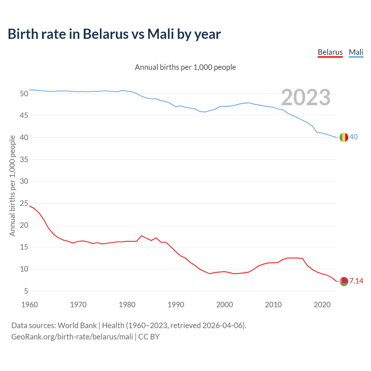 Belarus has an annual birth rate of 7.14 births per 1,000 people, compared to 40 for Mali. The average number of children a woman is expected to have during her lifetime — the fertility rate, is 1.21 in Belarus and 5.61 in Mali — 365% difference.