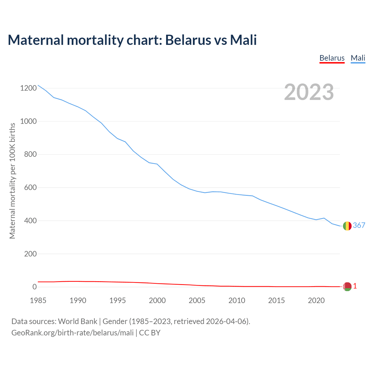 The maternal mortality rate, which is the probability of dying during childbirth or within 42 days of pregnancy termination, is 1 deaths per 100,000 live births in Belarus, compared to 367 deaths in Mali.