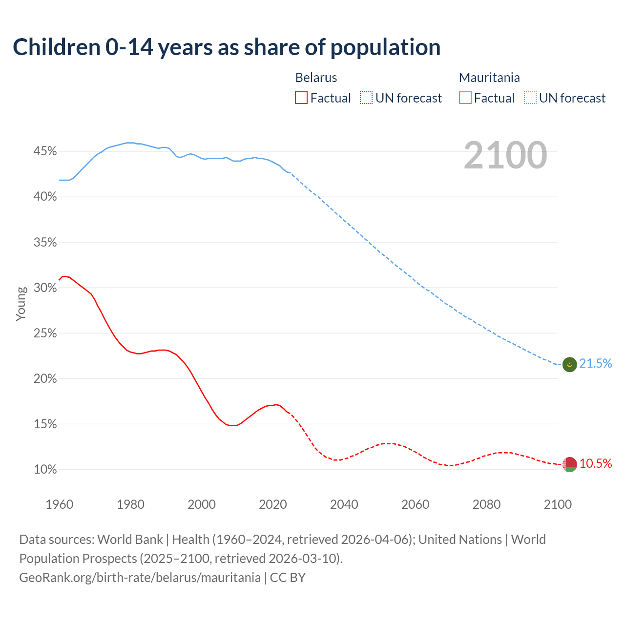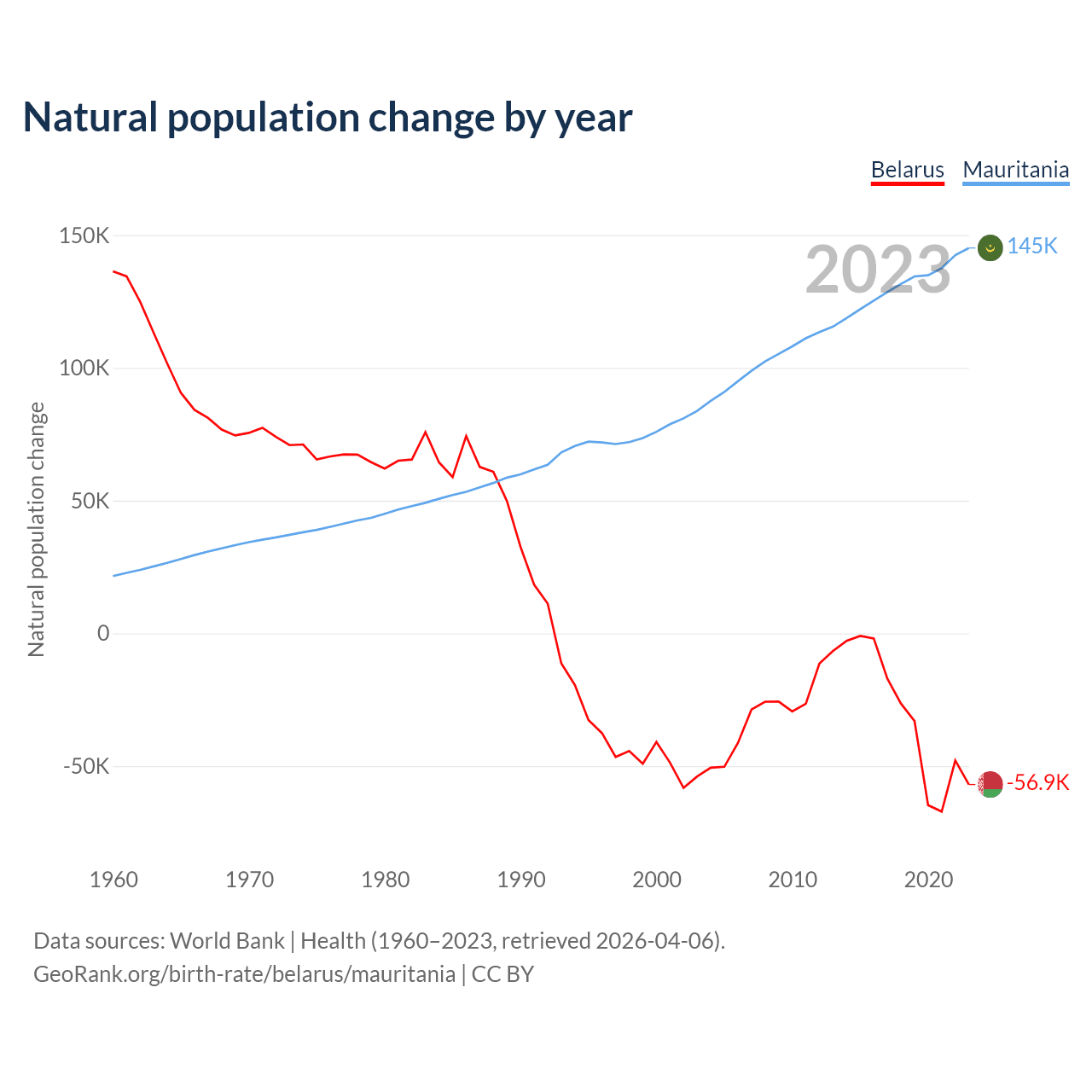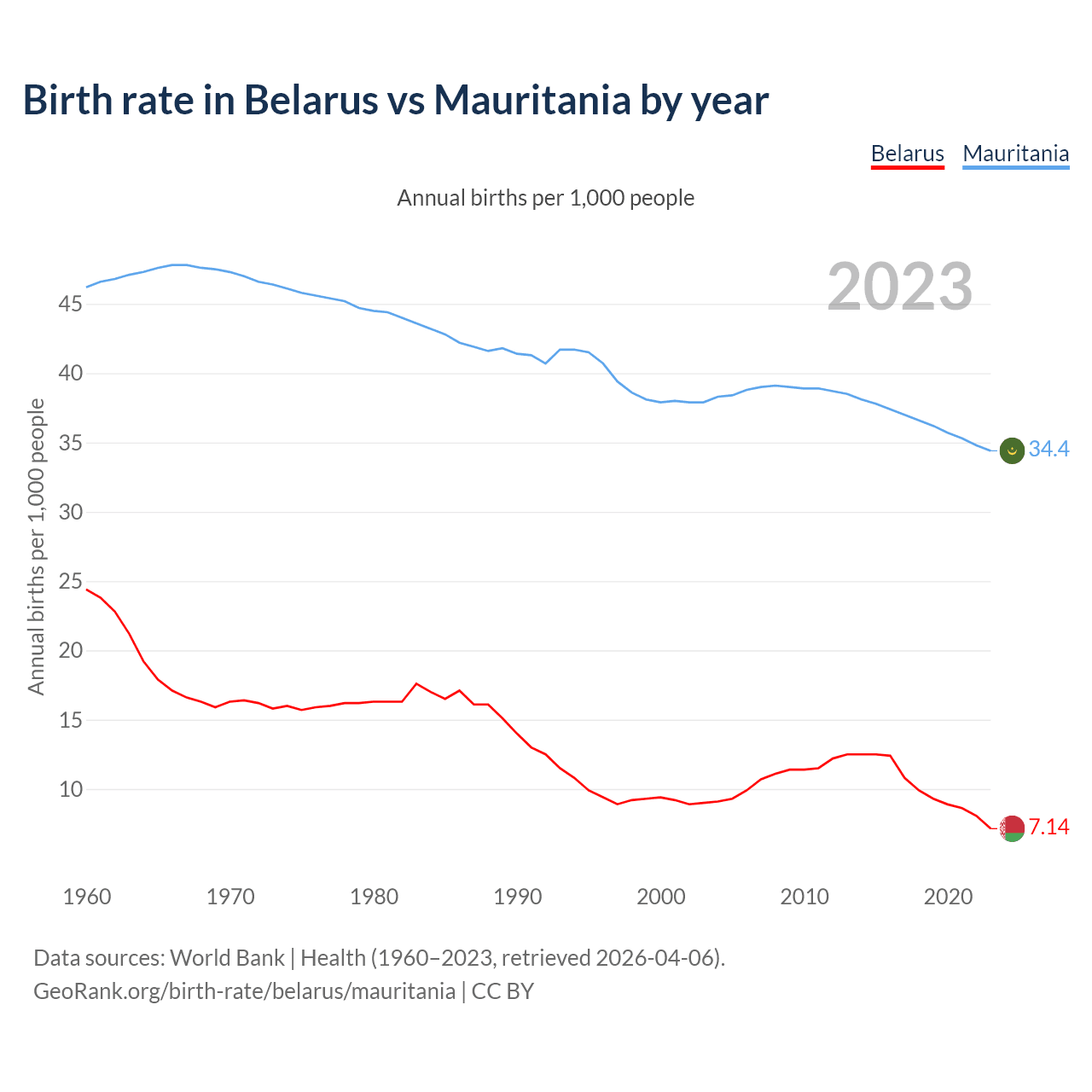 Belarus has an annual birth rate of 7.14 births per 1,000 people, compared to 34.4 for Mauritania. The average number of children a woman is expected to have during her lifetime — the fertility rate, is 1.21 in Belarus and 4.7 in Mauritania — 288.8% difference.