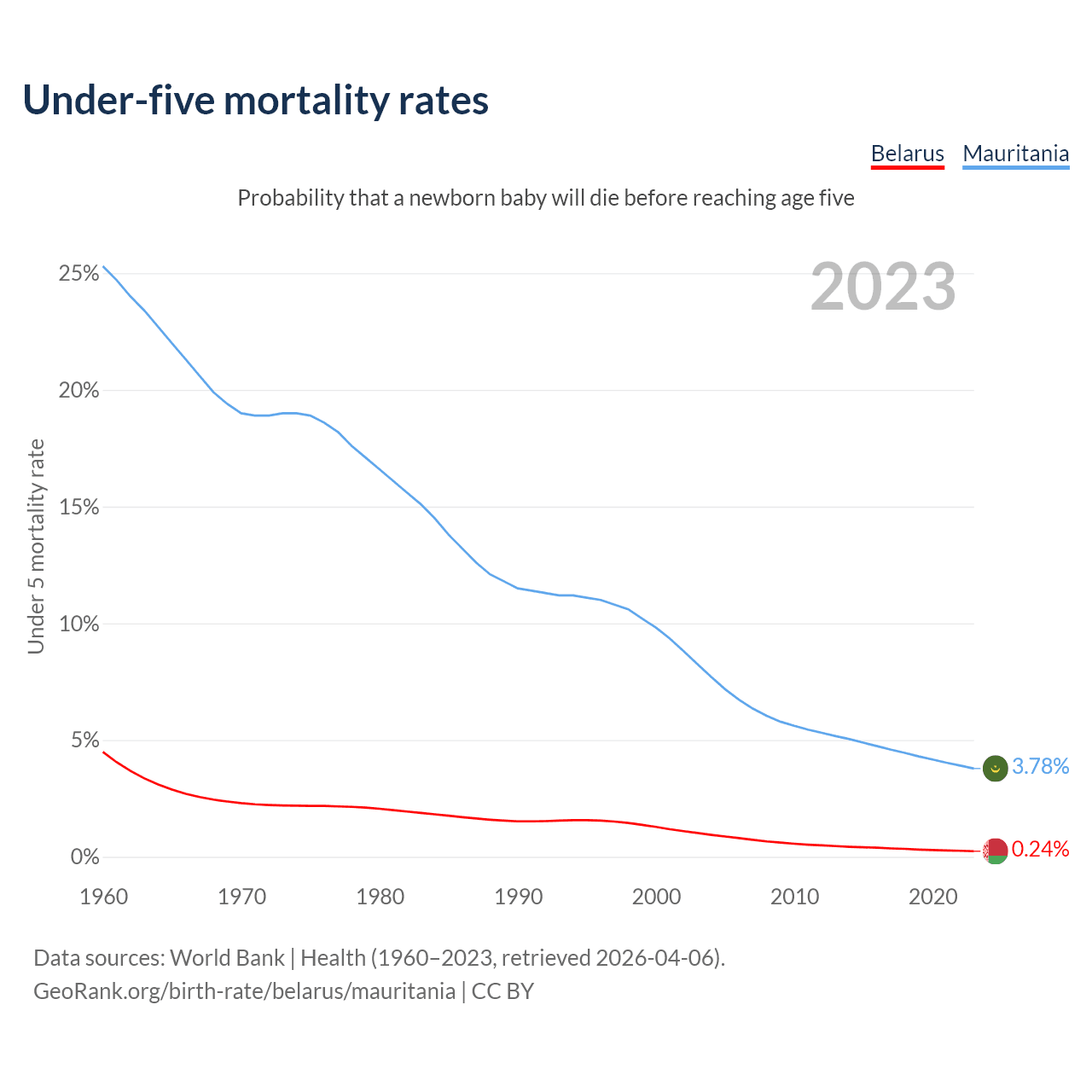 The chance that a newborn baby will die before reaching age five is 0.24% in Belarus and 3.78% in Mauritania. Above is a chart with historical data on under-five mortality rates.