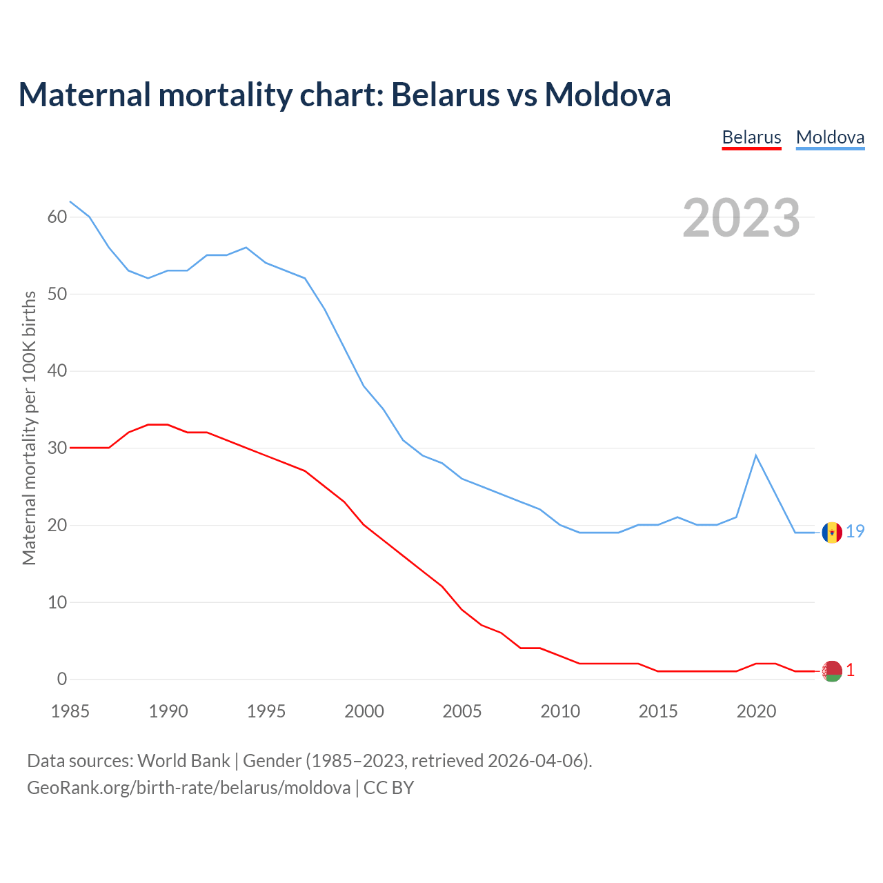 The maternal mortality rate, which is the probability of dying during childbirth or within 42 days of pregnancy termination, is 1 deaths per 100,000 live births in Belarus, compared to 19 deaths in Moldova.