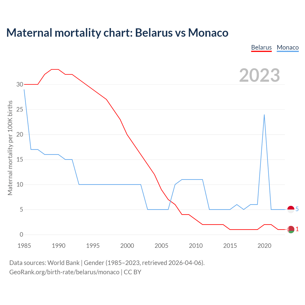 The maternal mortality rate, which is the probability of dying during childbirth or within 42 days of pregnancy termination, is 1 deaths per 100,000 live births in Belarus, compared to 5 deaths in Monaco.