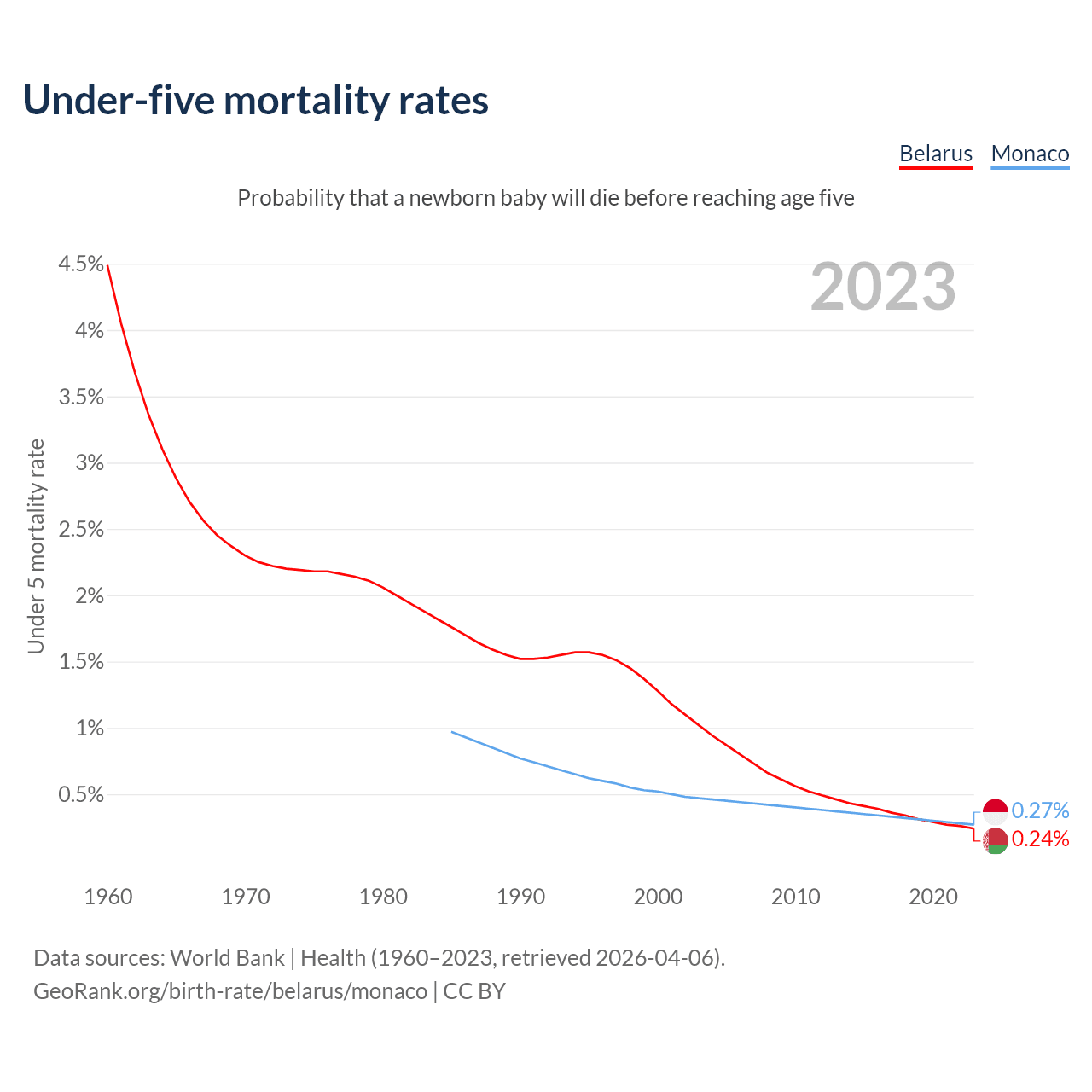 The chance that a newborn baby will die before reaching age five is 0.24% in Belarus and 0.27% in Monaco. Above is a chart with historical data on under-five mortality rates.