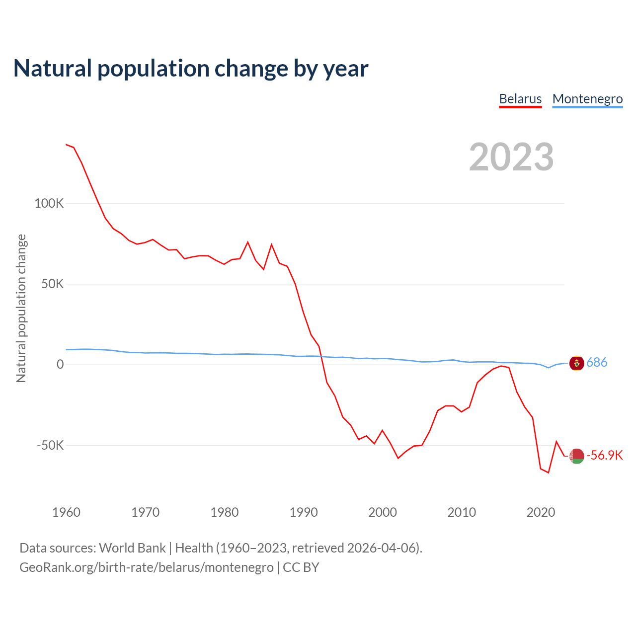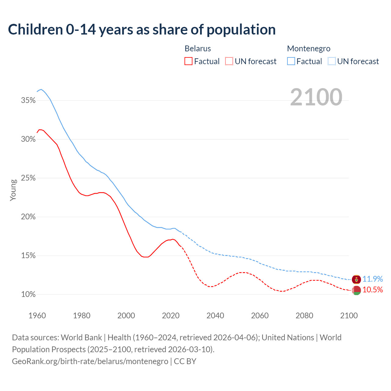 Belarus has an annual birth rate of 7.14 births per 1,000 people, compared to 11.2 for Montenegro. The average number of children a woman is expected to have during her lifetime — the fertility rate, is 1.21 in Belarus and 1.74 in Montenegro — 44% difference.