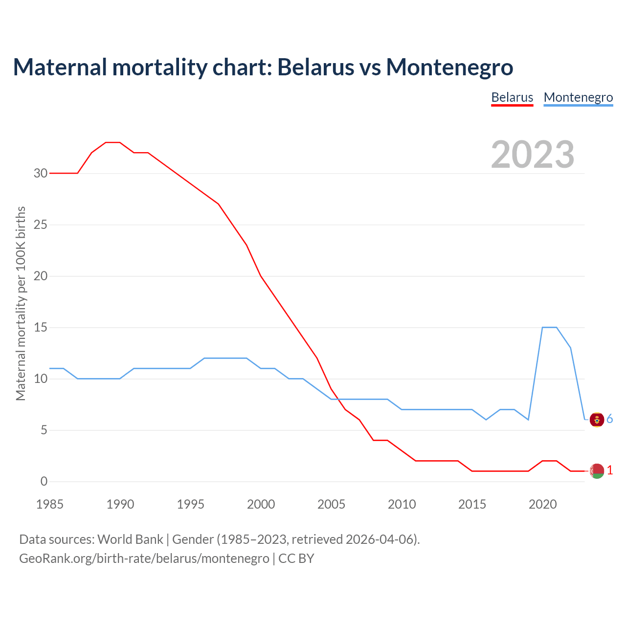 The maternal mortality rate, which is the probability of dying during childbirth or within 42 days of pregnancy termination, is 1 deaths per 100,000 live births in Belarus, compared to 6 deaths in Montenegro.