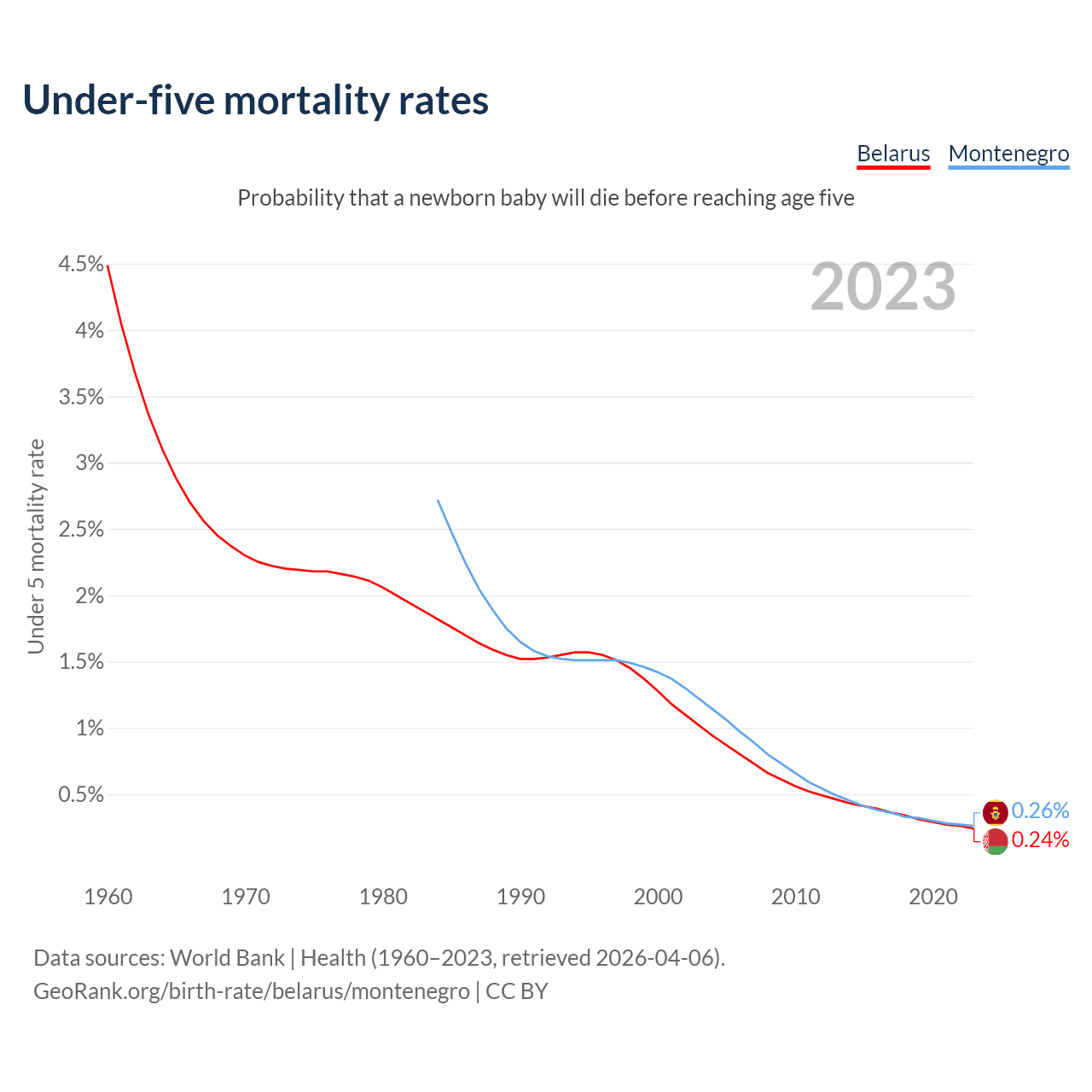 The chance that a newborn baby will die before reaching age five is 0.24% in Belarus and 0.26% in Montenegro. Above is a chart with historical data on under-five mortality rates.
