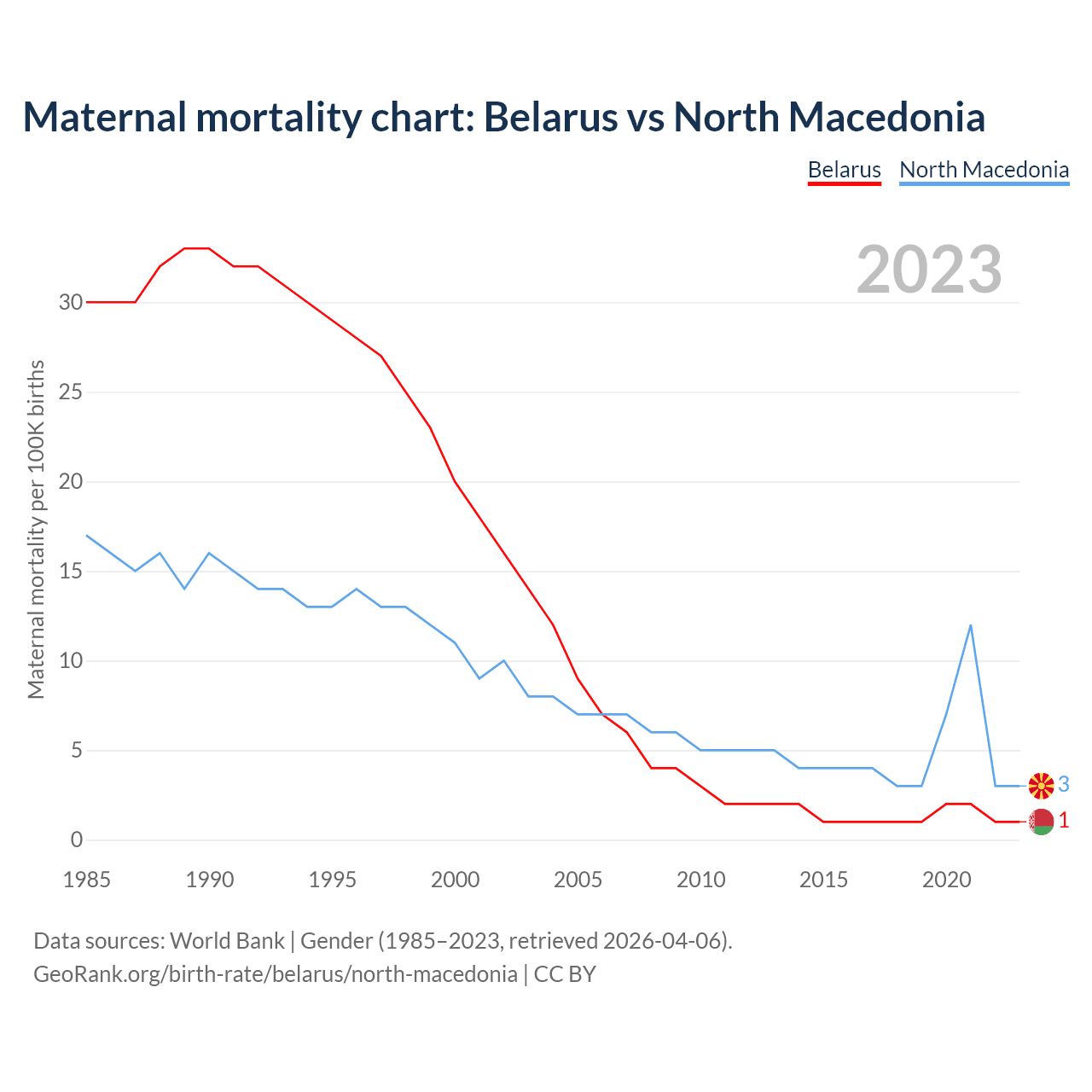 The maternal mortality rate, which is the probability of dying during childbirth or within 42 days of pregnancy termination, is 1 deaths per 100,000 live births in Belarus, compared to 3 deaths in North Macedonia.