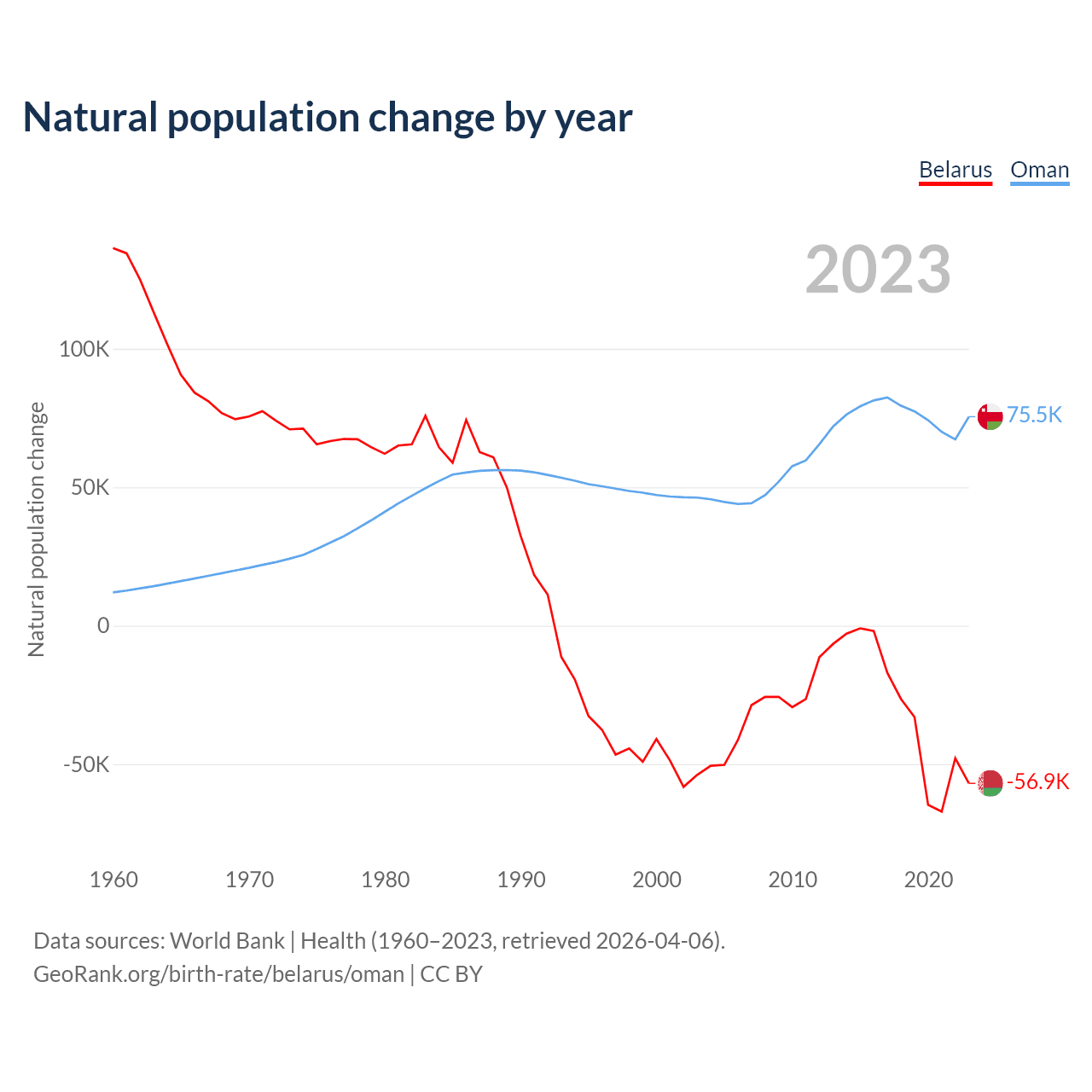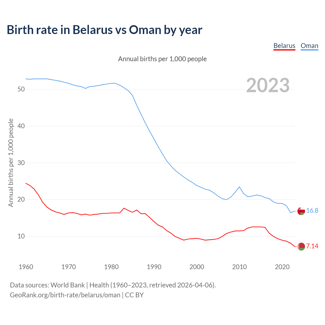 Belarus has an annual birth rate of 7.14 births per 1,000 people, compared to 16.8 for Oman. The average number of children a woman is expected to have during her lifetime — the fertility rate, is 1.21 in Belarus and 2.53 in Oman — 109% difference.
